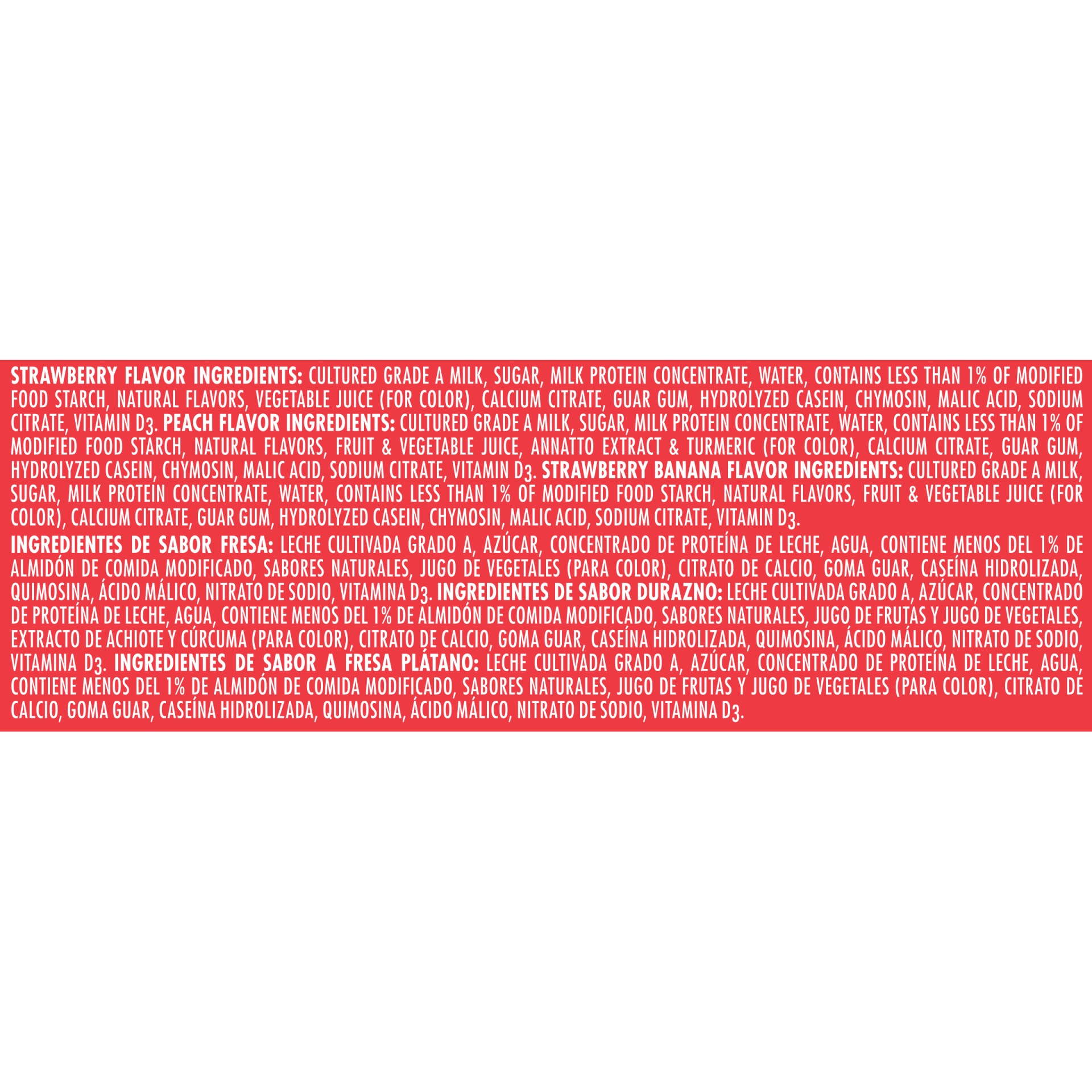 Strawberry: Strawberry Flavored with Other Natural Flavors Ingredients: Cultured Grade A Milk, Water, Sugar, Milk Protein Concentrate, Less than 1% of, Modified Food Starch, Calcium Citrate, Natural F…