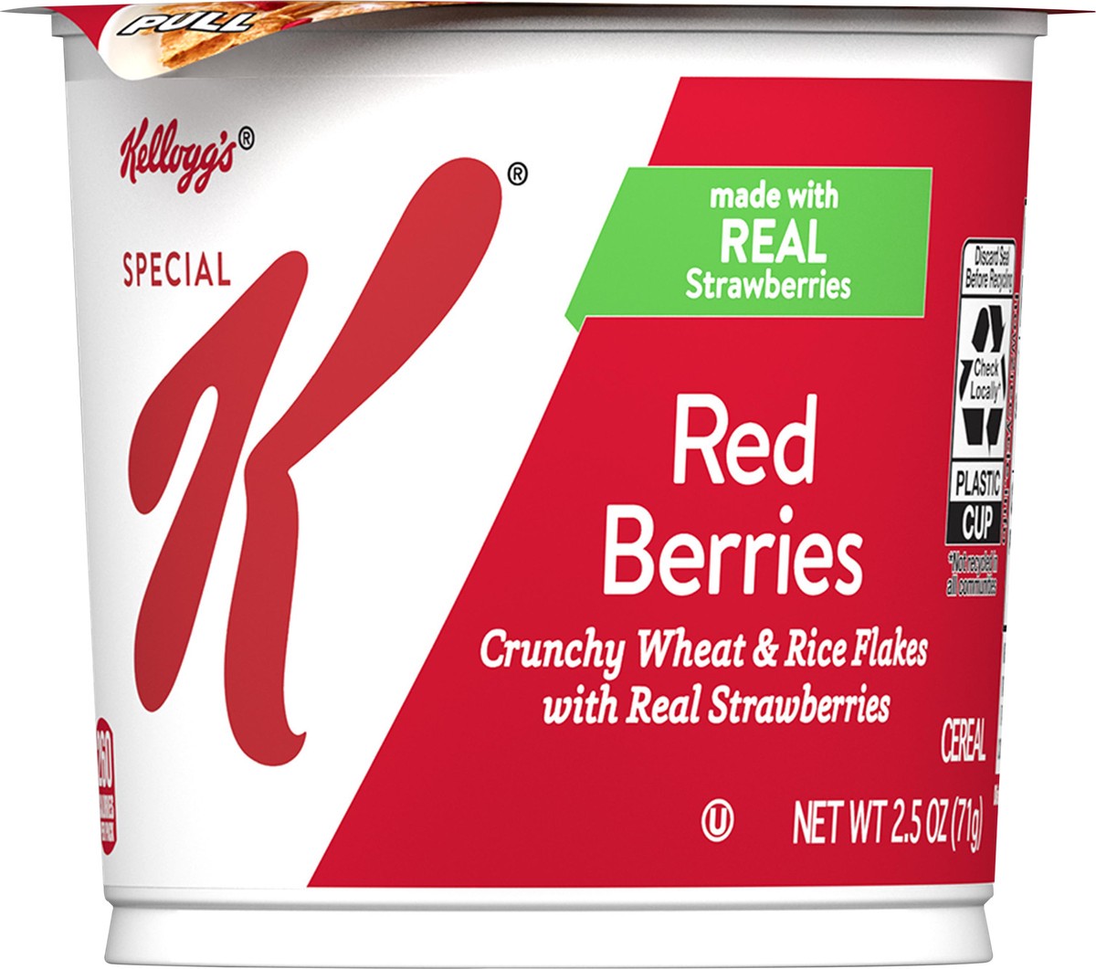 Made with real strawberries. Crunchy wheat & rice flakes with real strawberries. 260 calories per pack. Contains a bioengineered food ingredient. Pull. how2recycle.info. kelloggs.com. Visit: kelloggs.…