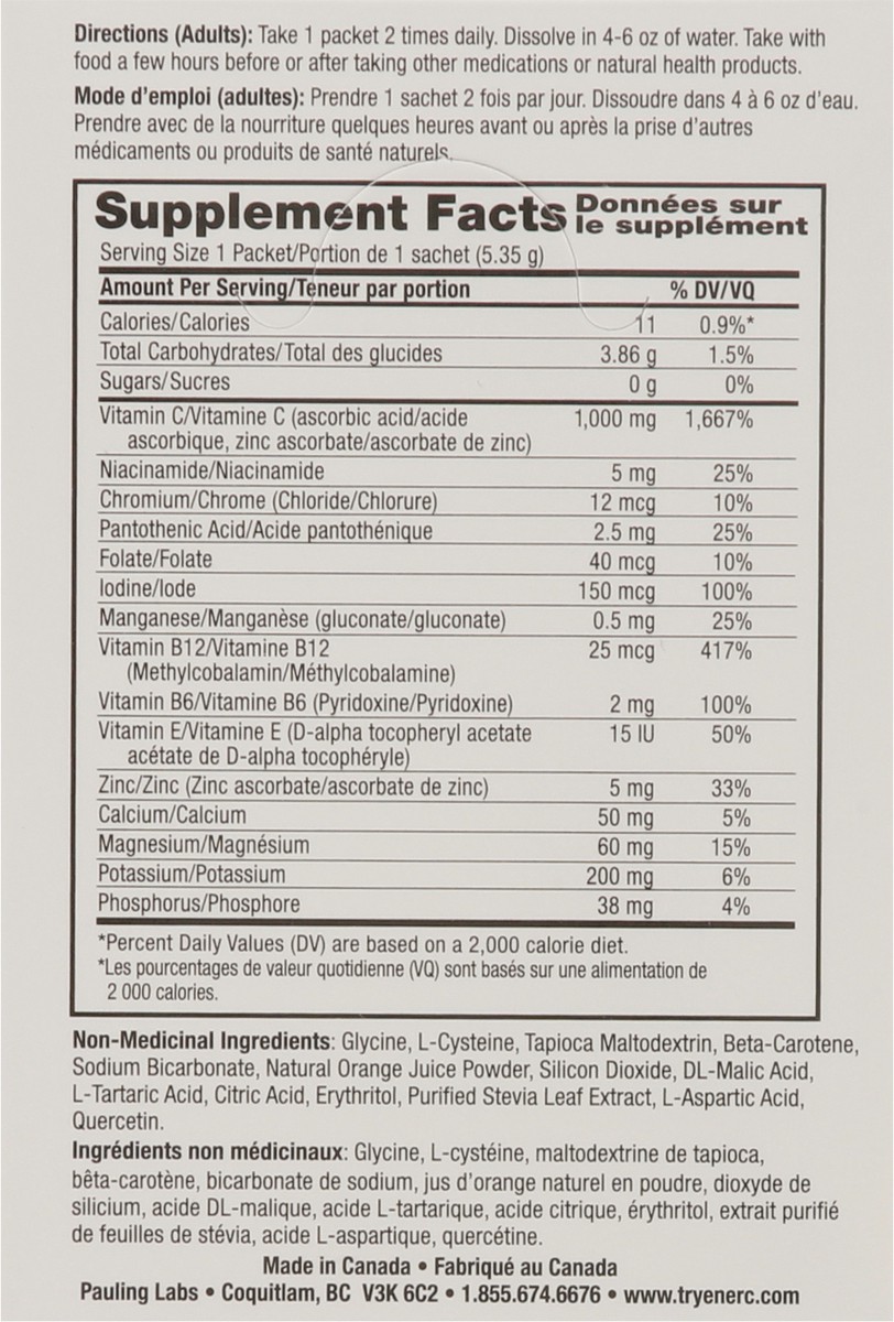 Non-Medicinal Ingredients: Glycine, L-Cysteine, Tapioca Maltodextrin, Beta-Carotene, Sodium Bicarbonate, Natural Orange Juice Powder, Silicon Dioxide, DL-Malic Acid, L-Tartaric Acid, Citric Acid, Eryt…