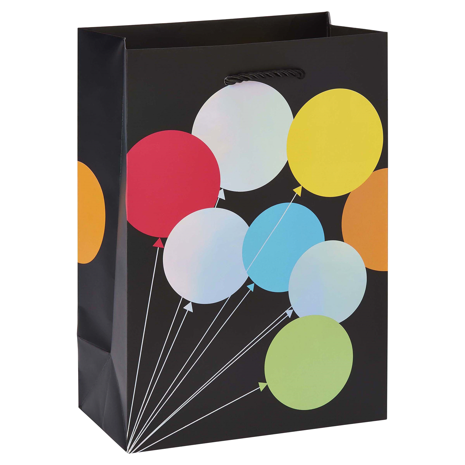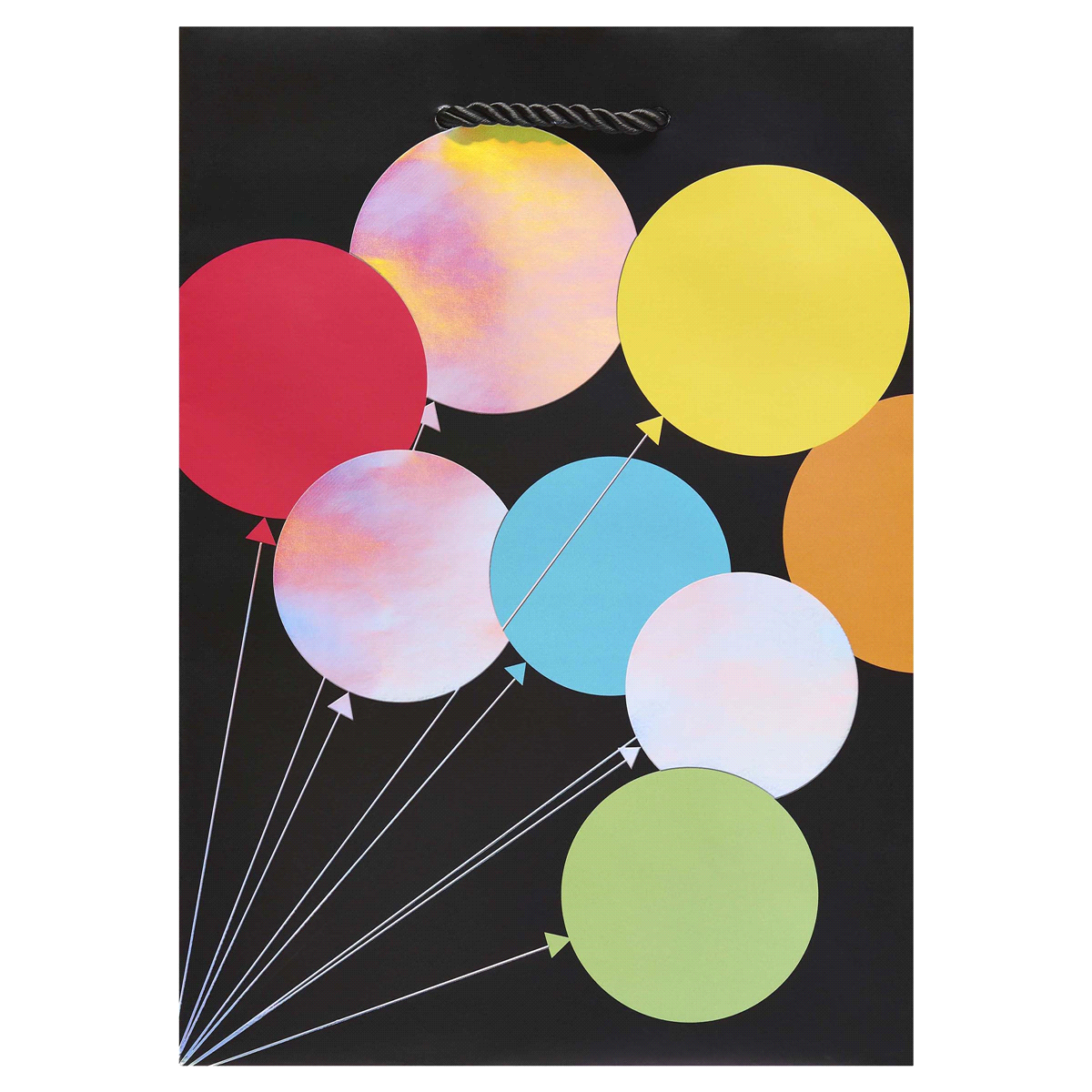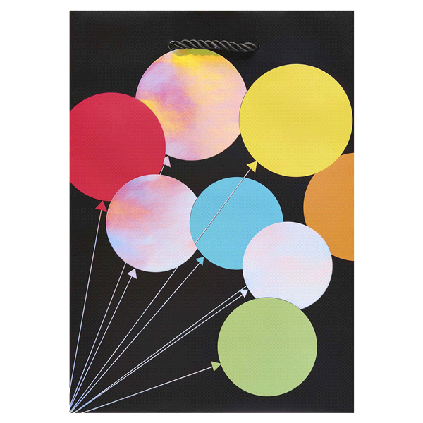 Share a bouquet of happiness! This gift bag features multicolored balloons overlapping on a matte black background with shimmering silver foil embellishments. Coordinating black cord handles add a stu…
