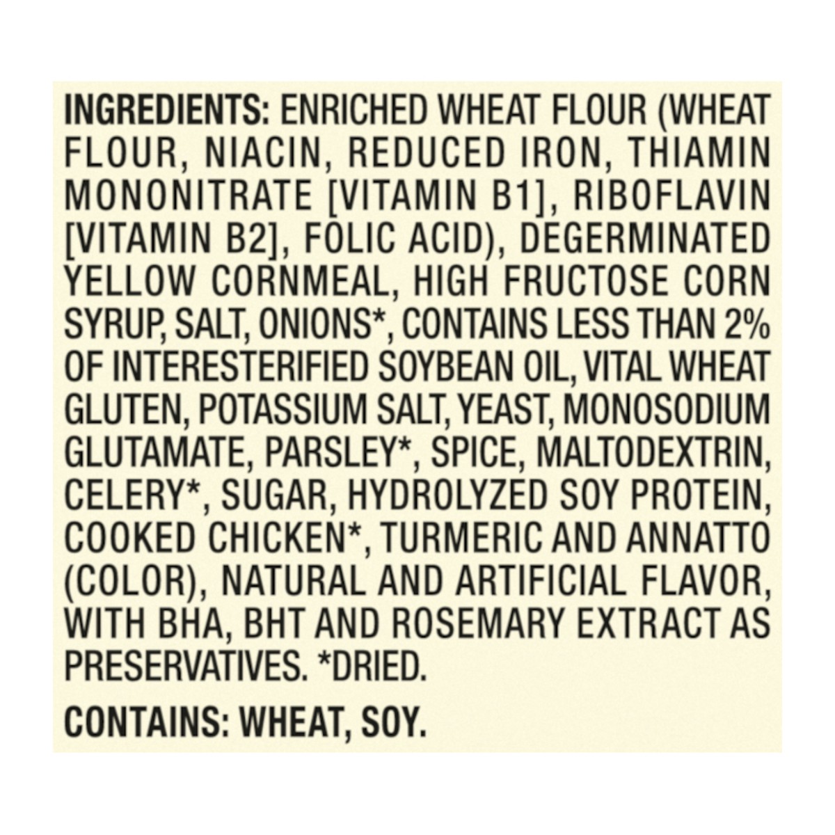 ENRICHED WHEAT FLOUR (WHEAT FLOUR, NIACIN, REDUCED IRON, THIAMIN MONONITRATE [VITAMIN B1], RIBOFLAVIN [VITAMIN B2], FOLIC ACID), DEGERMINATED YELLOW CORNMEAL, HIGH FRUCTOSE CORN SYRUP, SALT, ONIONS*, …