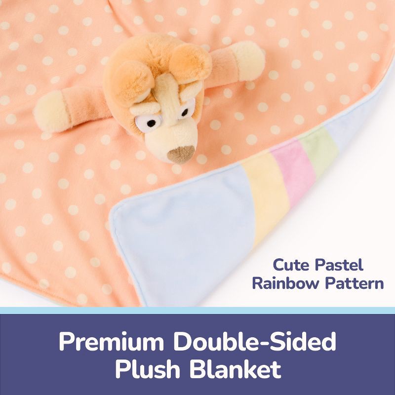 - This cute and sustainably made 13” lovey combines a Bingo stuffed animal with a double-sided security blanket for comfort anywhere baby needs it. The 15” square blanket's underside also features a cute pastel rainbow pattern.