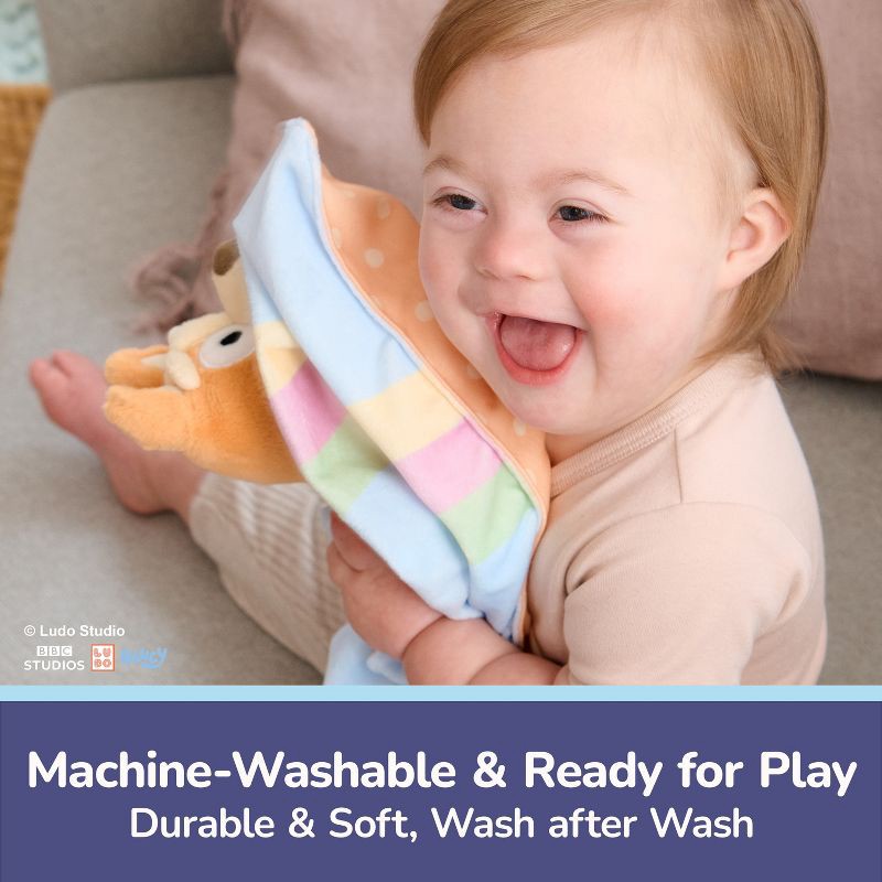 - This GUND collection is made with 100% recycled plush materials that stay soft even after countless hugs. This Bluey plush lovey is machine washable for easy cleaning and appropriate for kids and babies ages 0 and up.