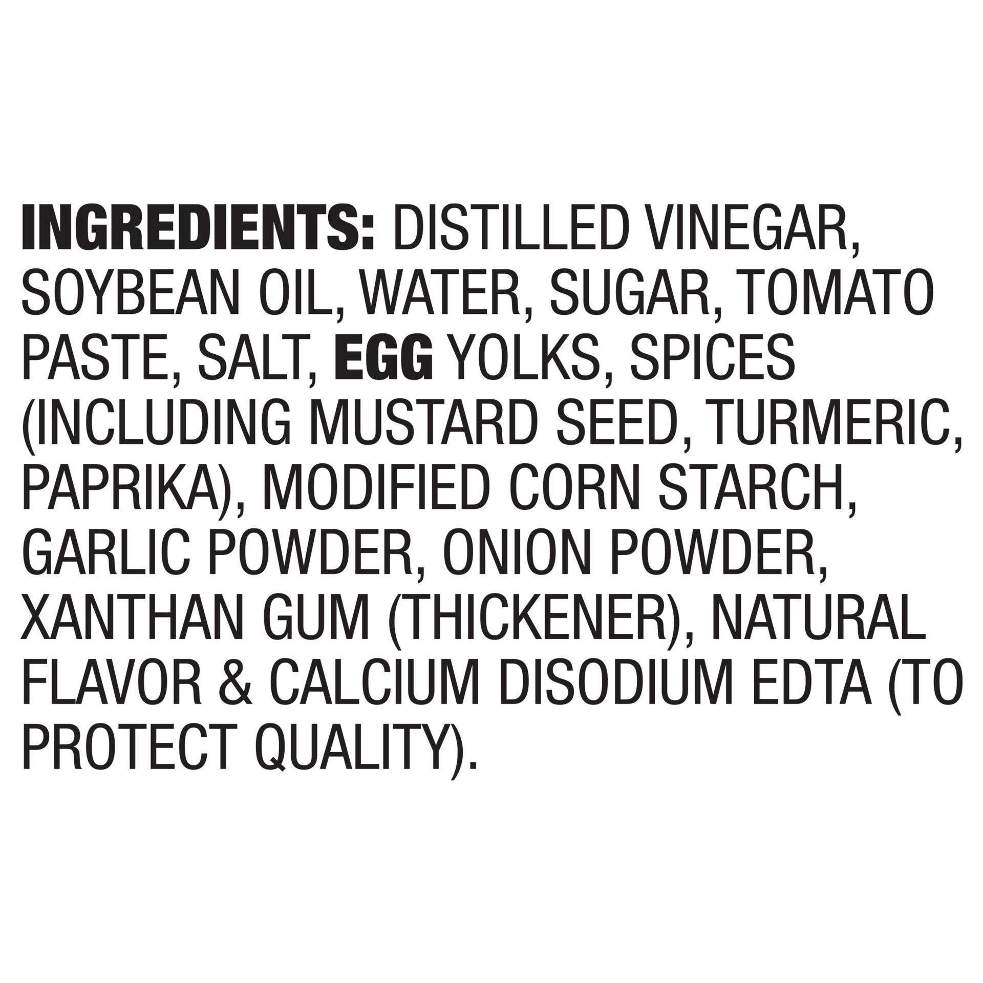DISTILLED VINEGAR, SOYBEAN OIL, WATER, SUGAR, TOMATO PASTE, SALT, EGG YOLKS, SPICES (INCLUDING MUSTARD SEED, TURMERIC, PAPRIKA), MODIFIED CORN STARCH, GARLIC POWDER, ONION POWDER, XANTHAN GUM (THICKEN…