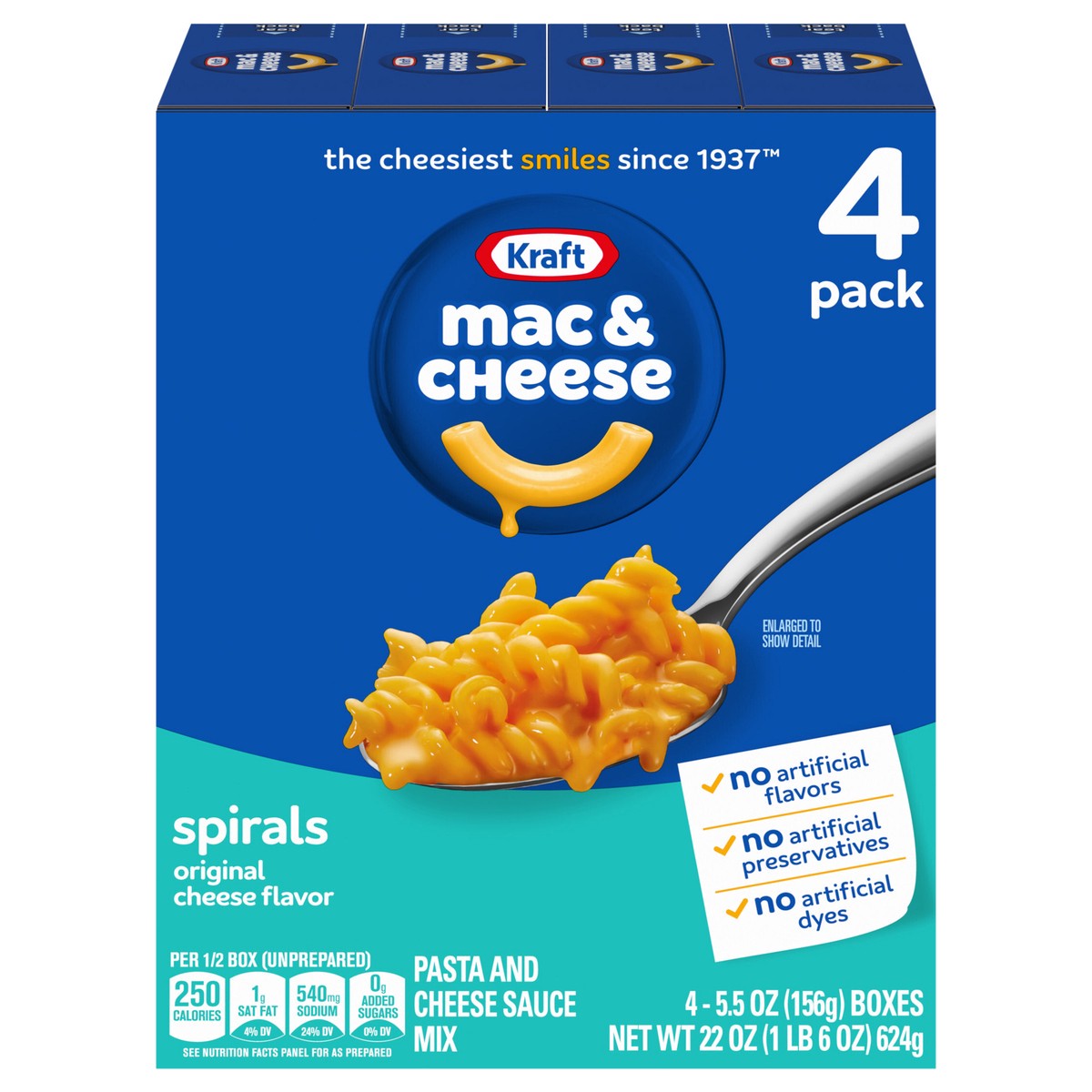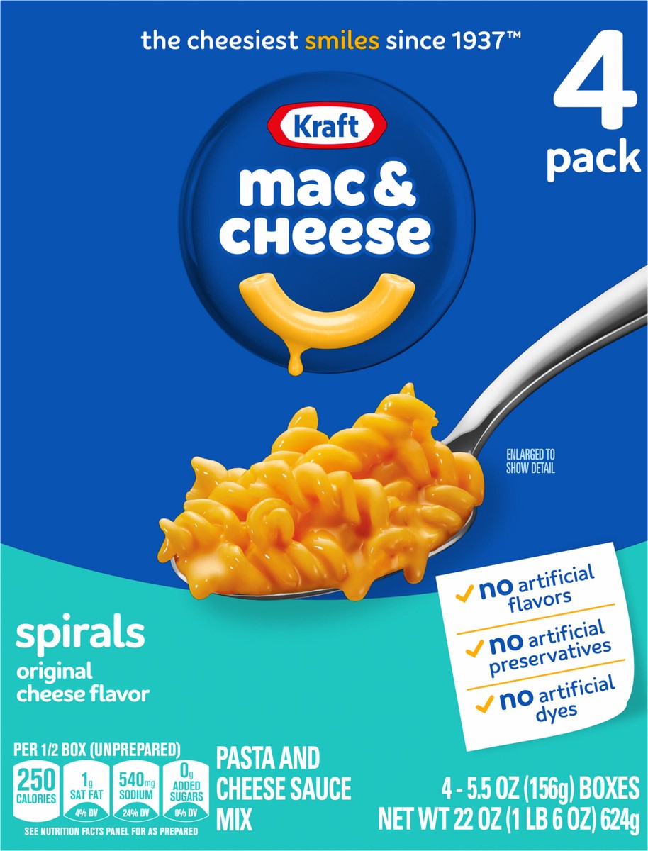 - KRAFT MAC AND CHEESE: Four 5.5 oz boxes of Kraft Spirals Original Mac & Cheese Macaroni and Cheese Dinner