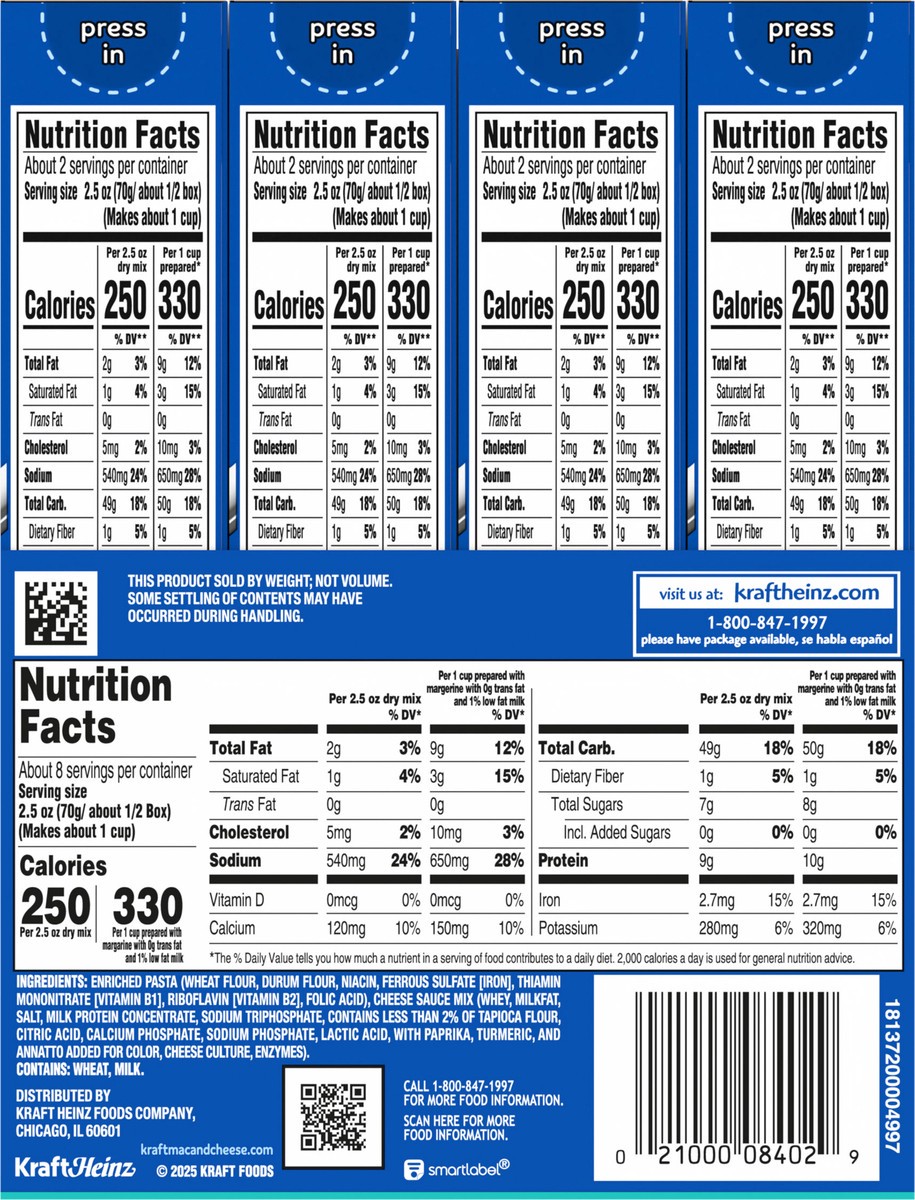 Enriched Pasta (Wheat Flour, Durum Flour, Niacin, Ferrous Sulfate [Iron], Thiamin Mononitrate [Vitamin B1], Riboflavin [Vitamin B2], Folic Acid), Cheese Sauce Mix (Whey, Milkfat, Salt, Milk Protein Co…