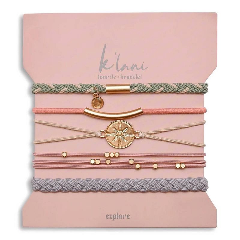 Our EXPLORE set includes five Hair Tie Bracelets in earthy tones of tan, pink, gray, and green, perfect for everyday adventures. Comfortable and durable on your wrist or in your hair, the gold compass…