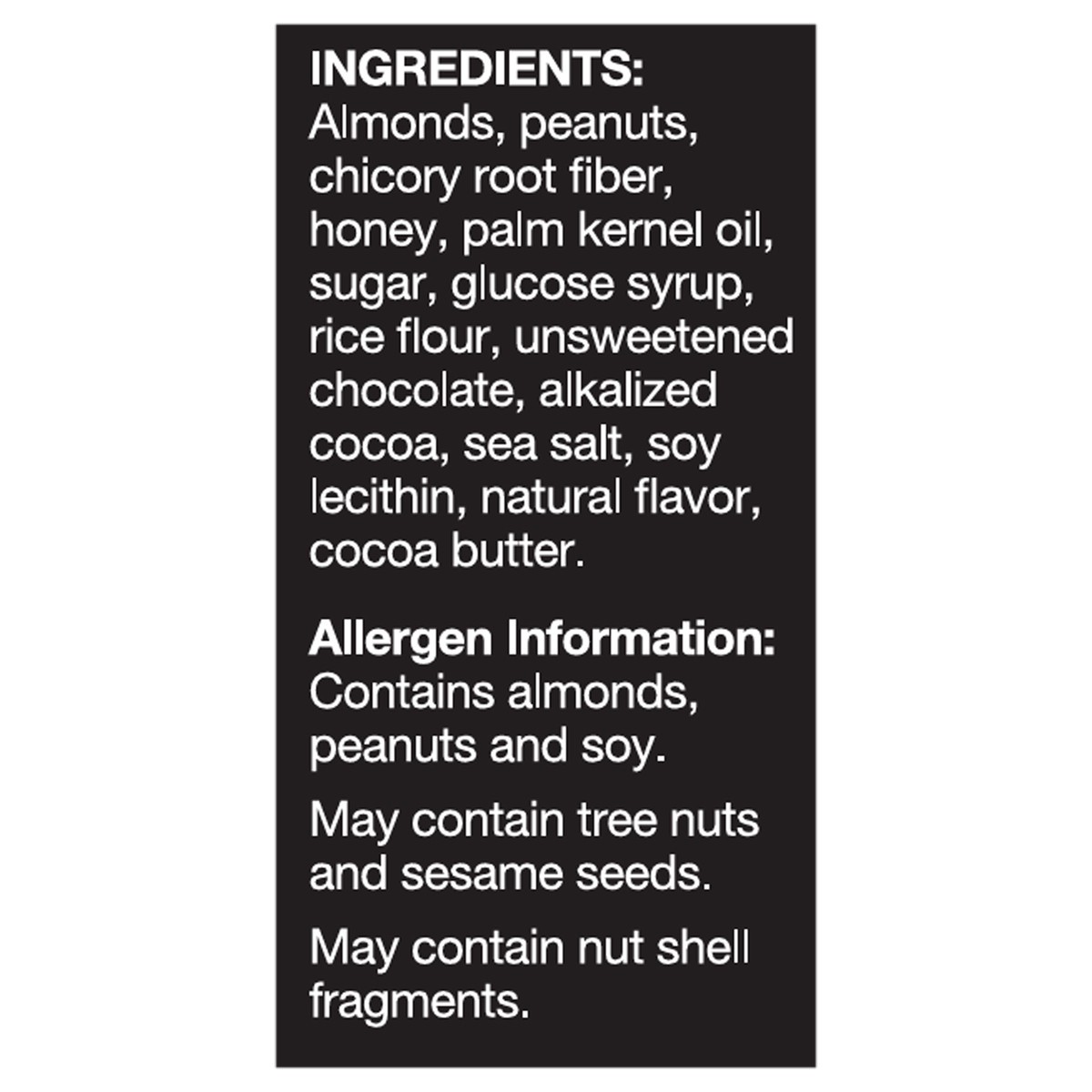 Almonds, Peanuts, Chicory Root Fiber, Honey, Palm Kernel Oil, Sugar, Glucose Syrup, Rice Flour, Unsweetened Chocolate, Alkalized Cocoa, Sea Salt, Soy Lecithin, Natural Flavor, Cocoa Butter.