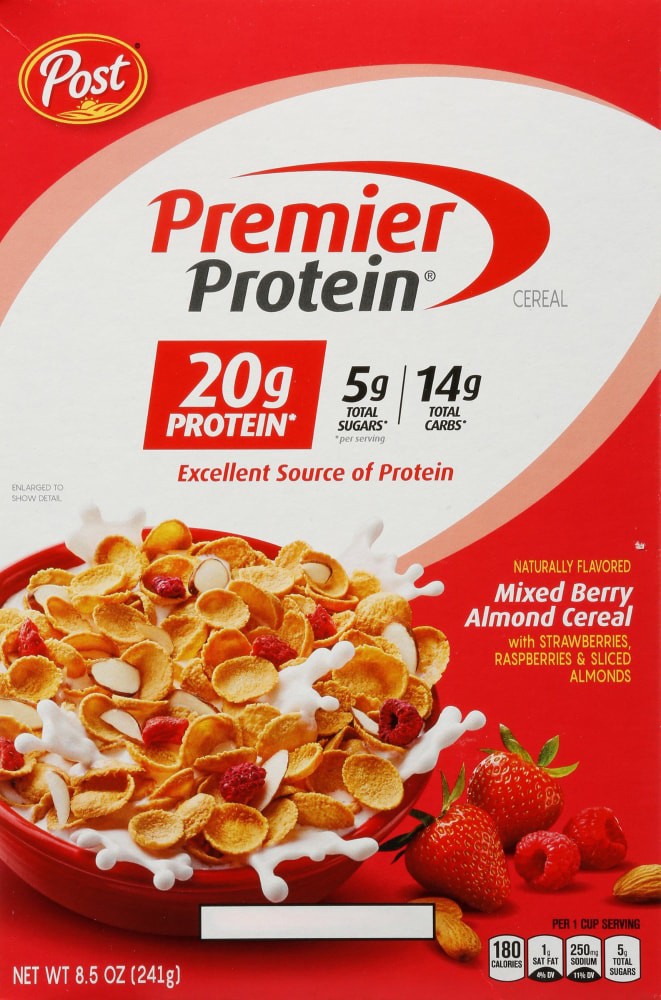 Post Premier Protein Mixed Berry Almond cereal, high protein cereal, protein-rich breakfast or snack made with real berries and almonds