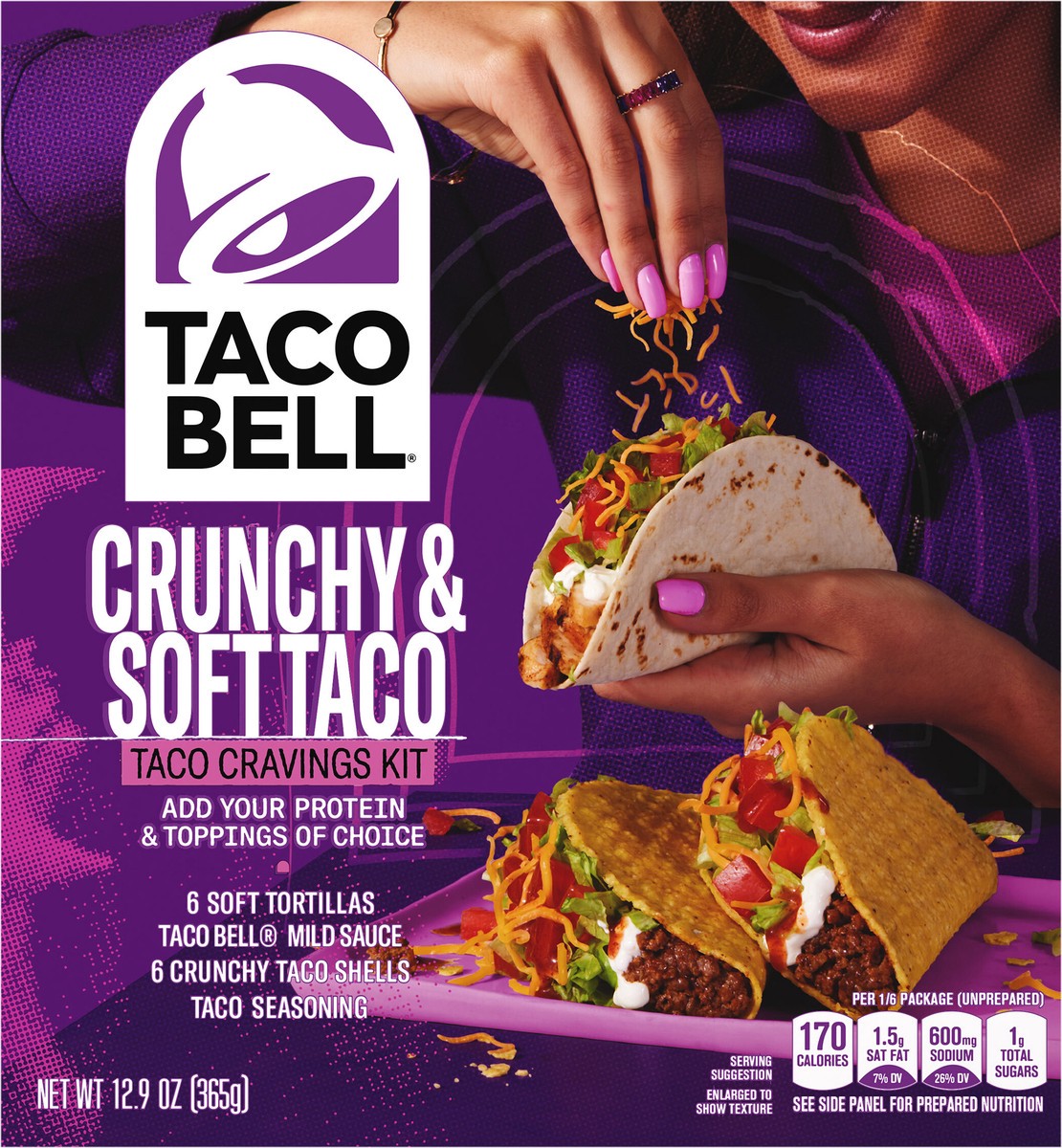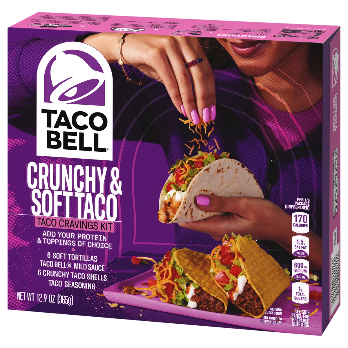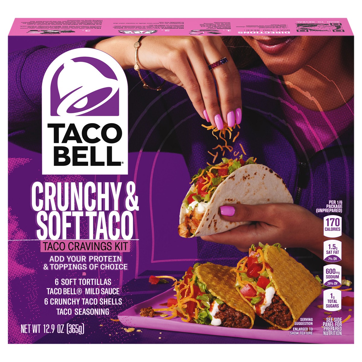 Live más at home with our Taco Bell Crunchy & Soft Taco Cravings Kit. Taco Bell makes mealtime more craveable with our dinner kit that contains 6 soft tortillas, 6 crunchy taco shells, Taco Bell Mild …