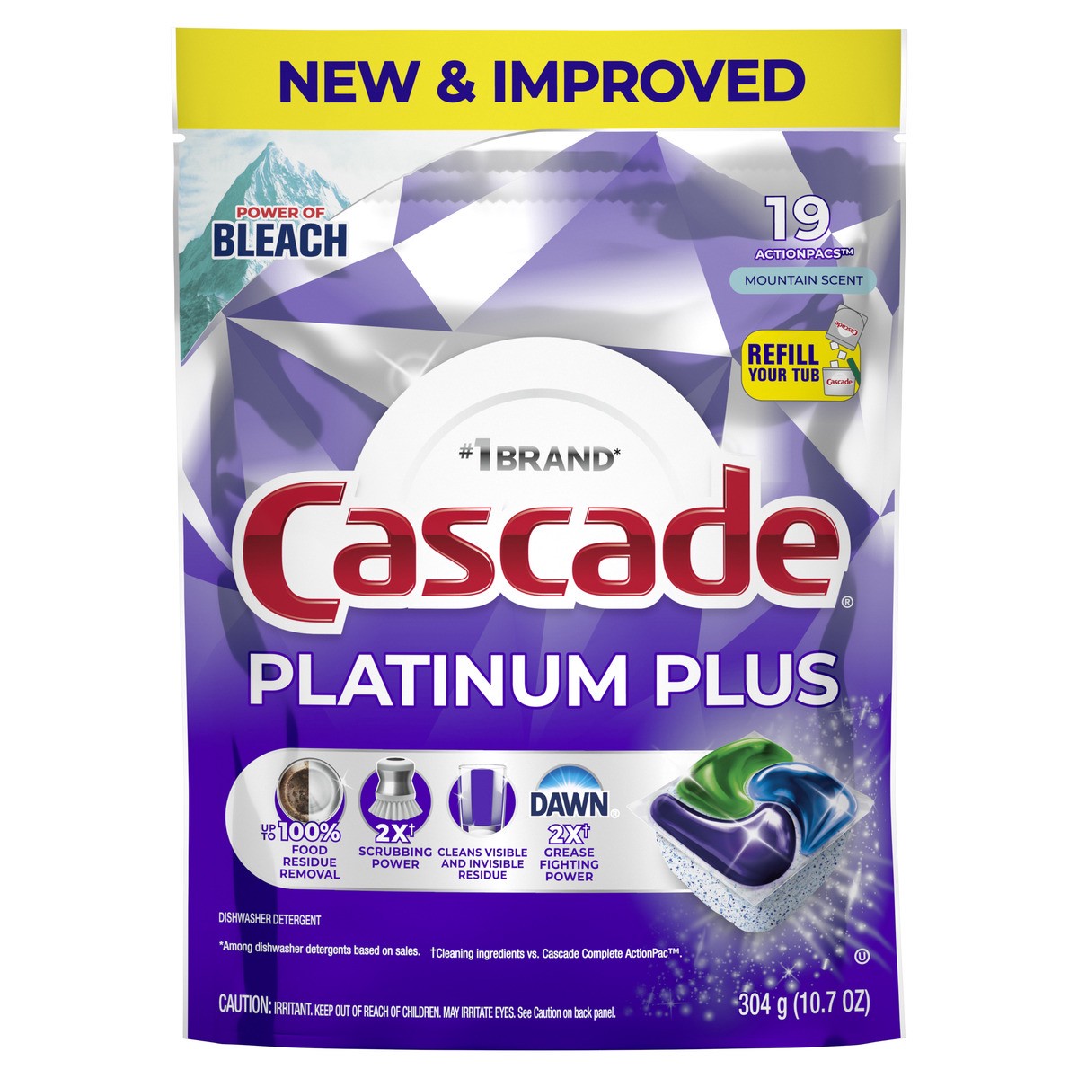 - Only Cascade Platinum Plus contains 2X* the Dawn grease fighting power and 2X* the scrubbing power to power through dried on food *Cleaning ingredients vs Cascade Complete ActionPacs