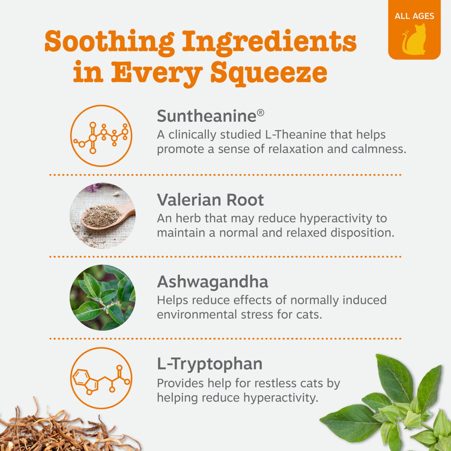 L-Tryptophan, L-Theanine (SunTheanine), Valerian Root, Vitamin B1 (Thiamine), Ashwagandha, Canola Oil, Chicken Liver Powder, Citric Acid (a preservative), Glycerin, Guar Gum, Malt Syrup, Mixed Tocophe…