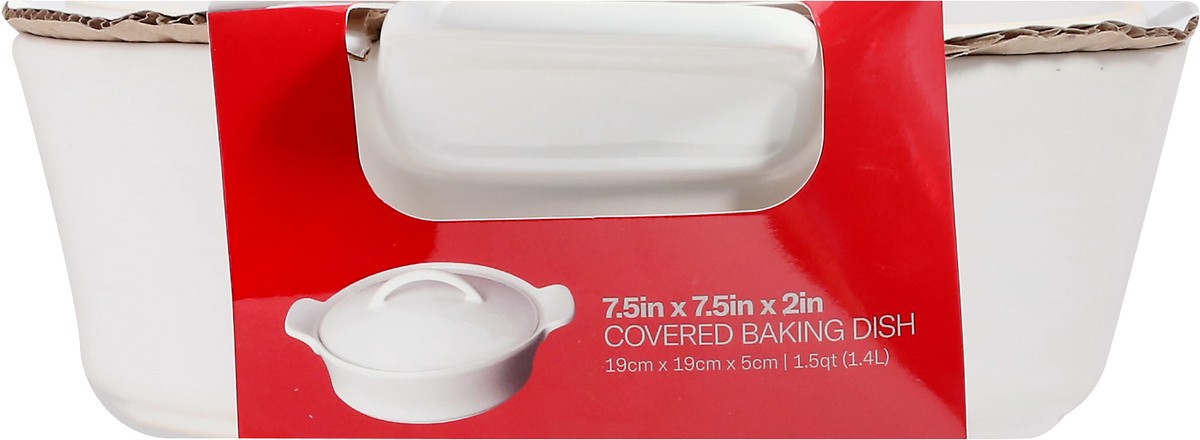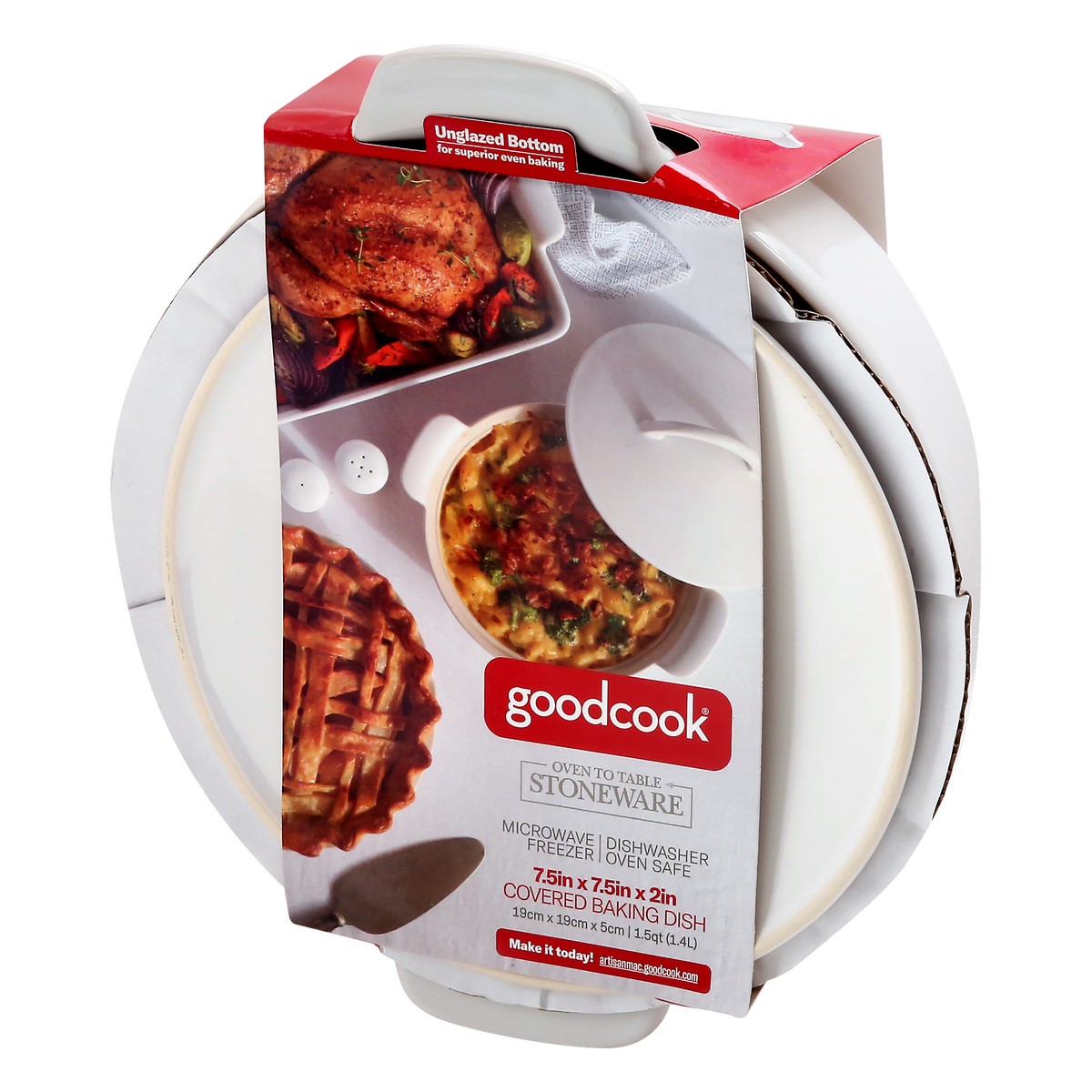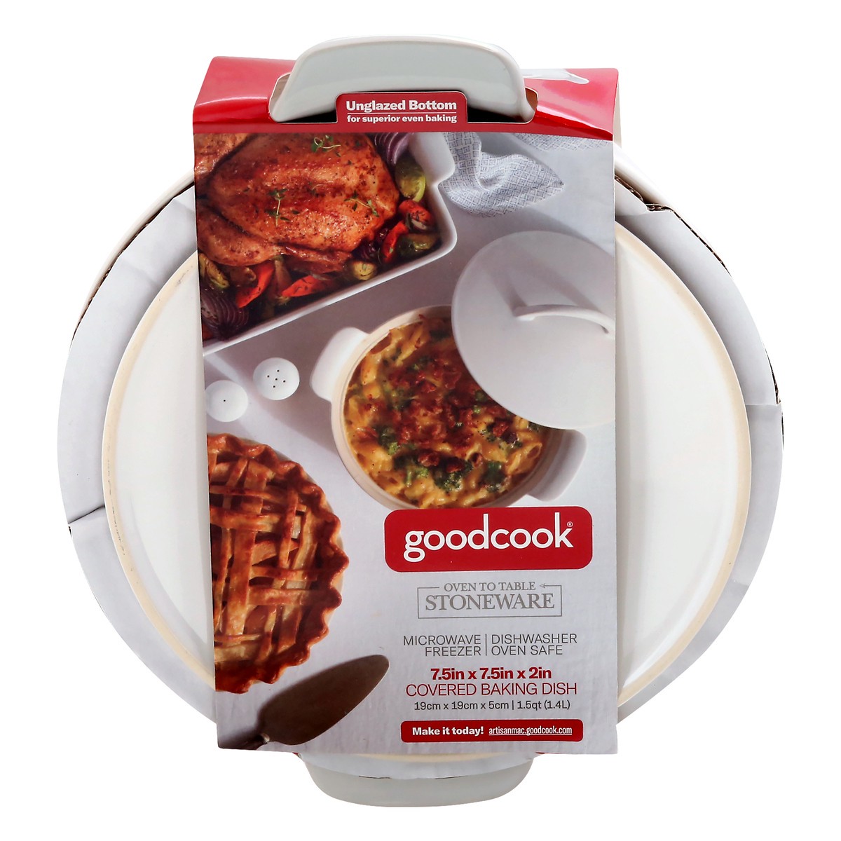 7.5in x 7.5in x 1in. 19 cm x 19 cm x 5 cm | 1.5 qt (1.4 l). Unglazed bottom for superior even baking. Oven to table stoneware. Microwave freezer. Dishwasher oven safe. Make it today! Unglazed bottom f…