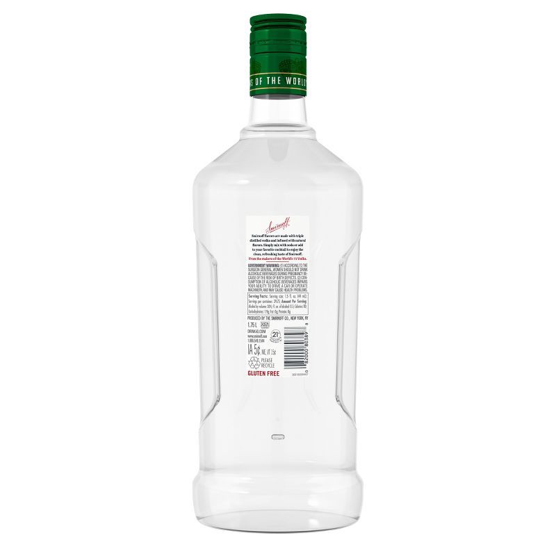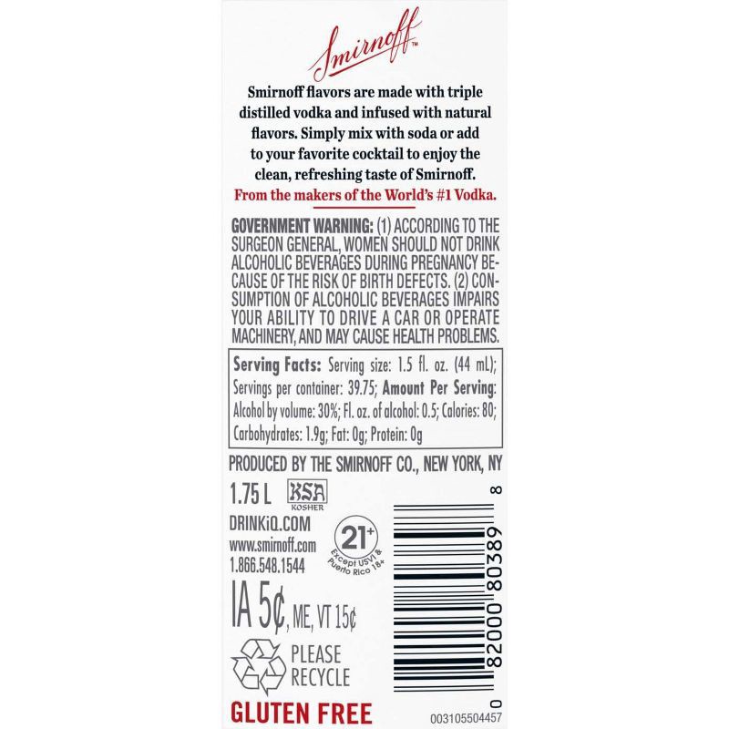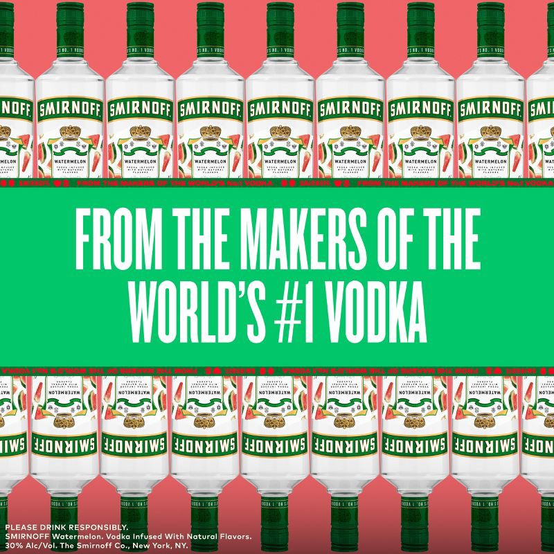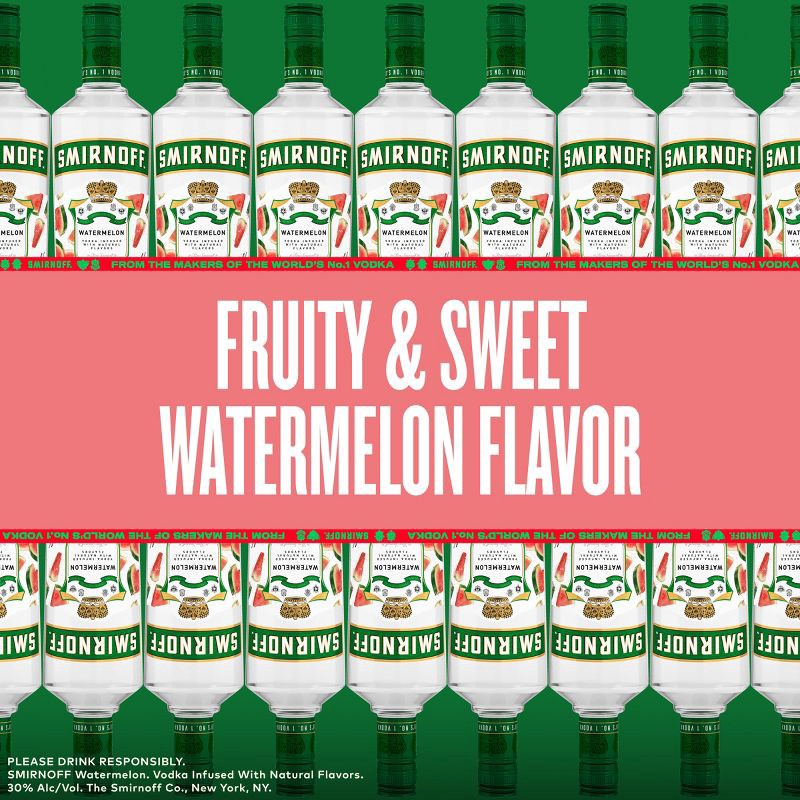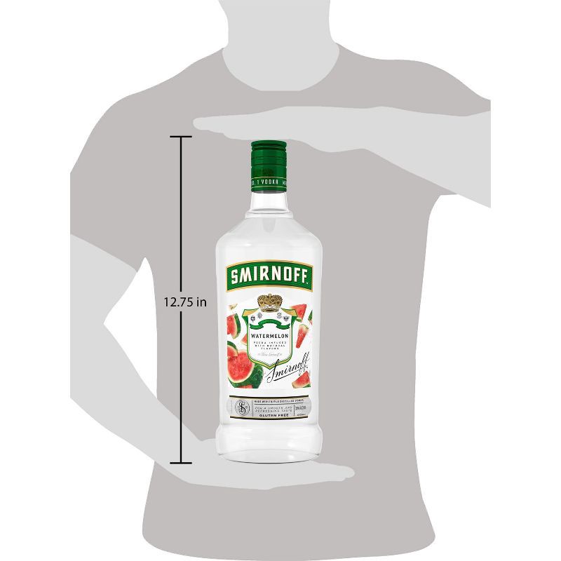 - One 1.75 L recyled plastic bottle of Smirnoff WatermelonAwarded a gold medal at the 2019 SIP Awards60-proof - offering a fruity flavored experiencePerfect as a gift or for any celebrationCertified Kosher and gluten freePerfect for drinking on its own or with mixed beveragesFrom the Makers of the World's No. 1 VodkaJuicy and tantalizing, this vodka-based watermelon flavored will have you coming back for morePerfect for drinking on its own or with mixed beverages