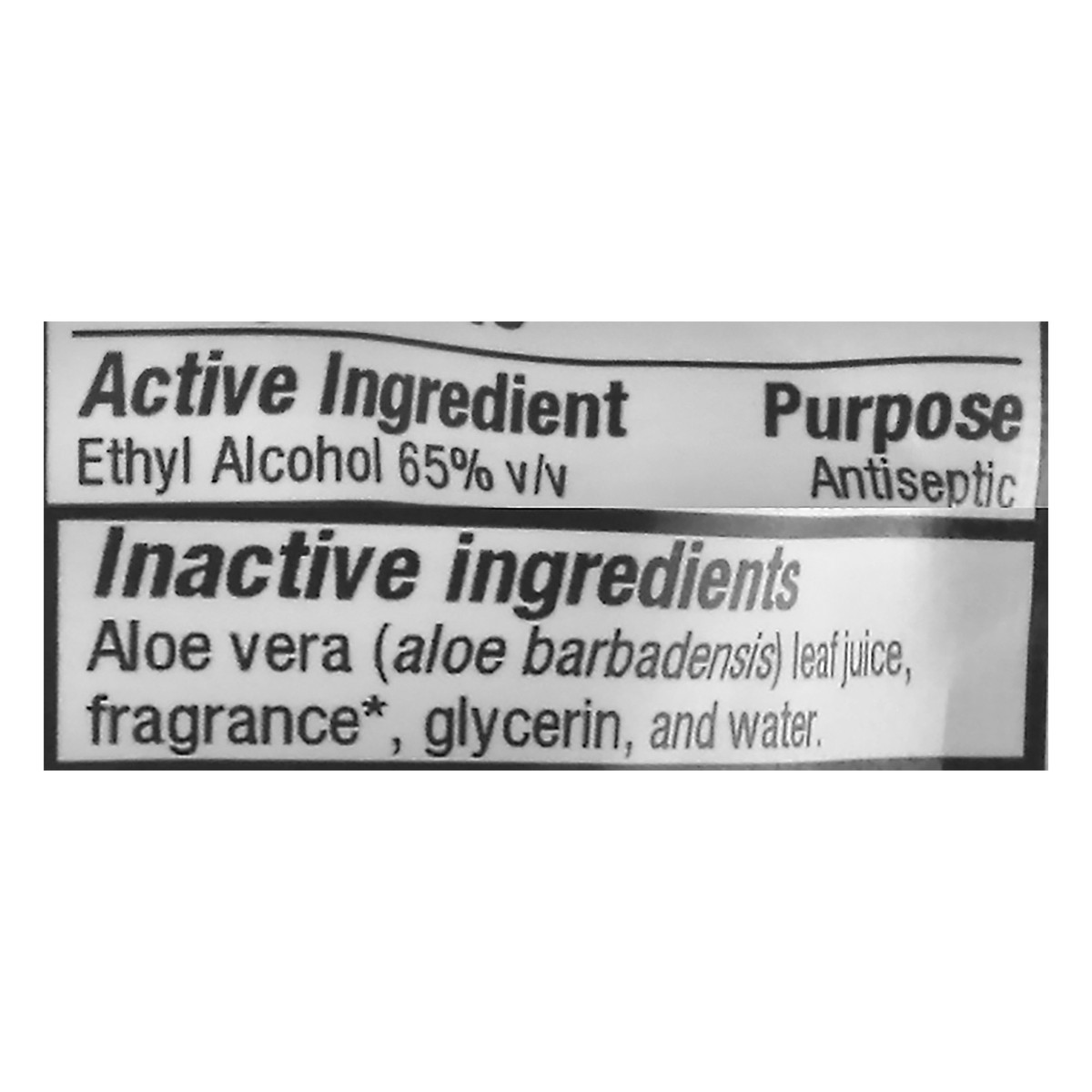 Active Ingredients: Ethyl Alcohol v/v (65 %), Antiseptic. Inactive Ingredients: Aloe Vera (Aloe Barbandesis) Leaf Juice, Fragrance (Essential Oil Blend), Glycerin, Water.