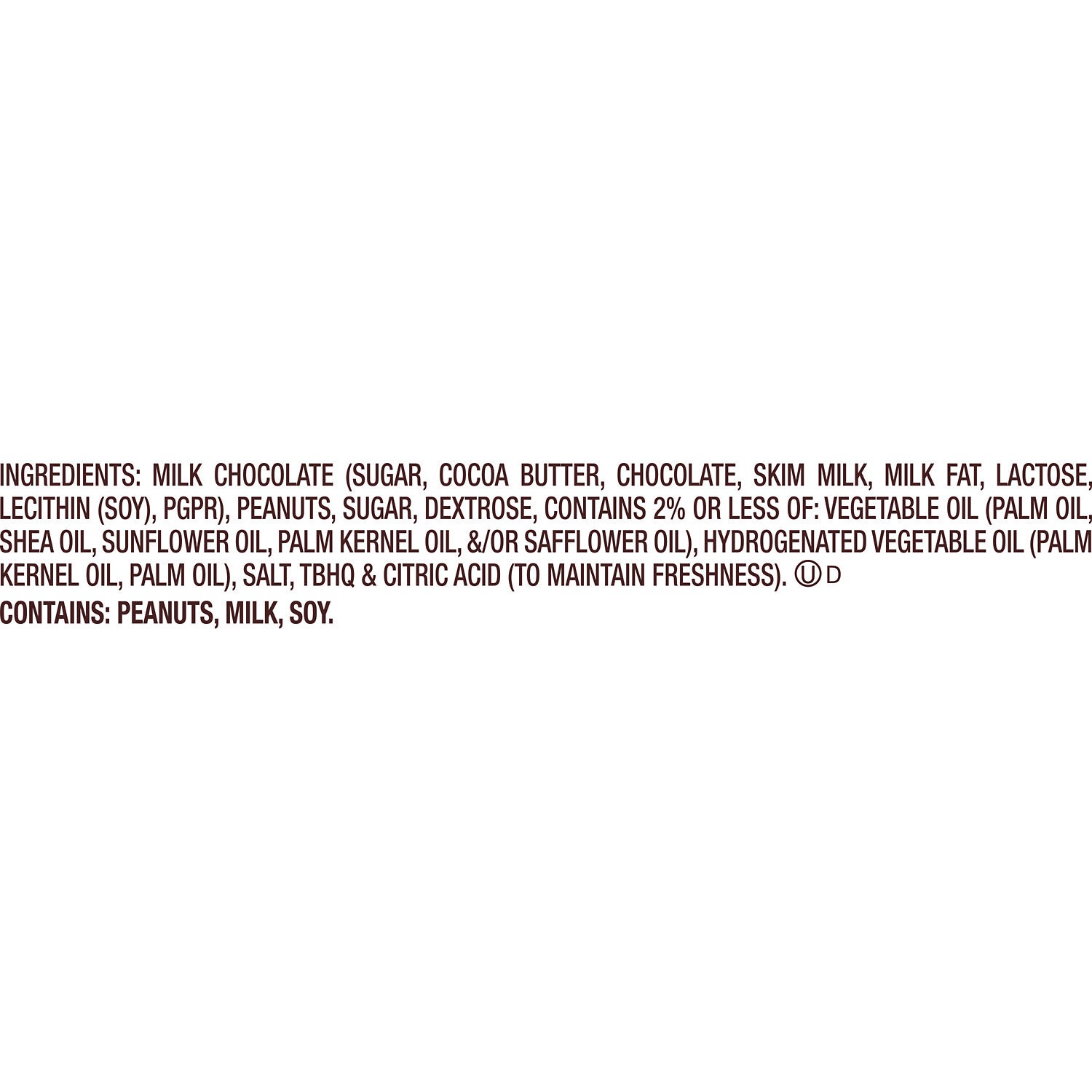 MILK CHOCOLATE (SUGAR, COCOA BUTTER, CHOCOLATE, SKIM MILK, MILK FAT, LACTOSE, LECITHIN (SOY), PGPR), PEANUTS, SUGAR, DEXTROSE, CONTAINS 2% OR LESS OF: VEGETABLE OIL (PALM OIL, SHEA OIL, SUNFLOWER OIL,…