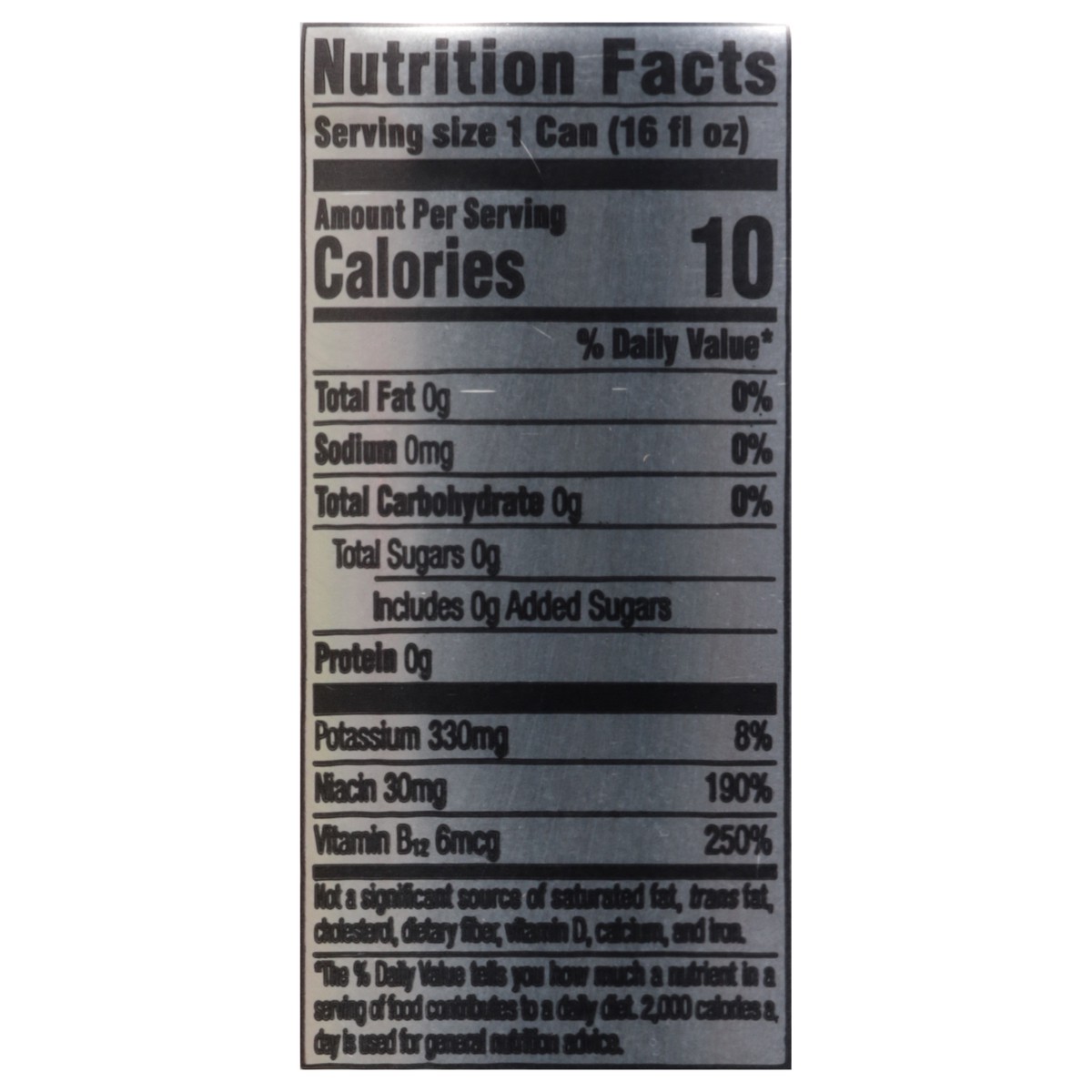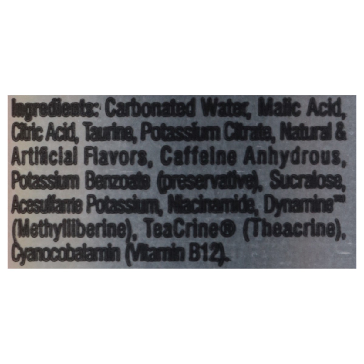 Carbonated Water, Malic Acid, Citric Acid, Taurine, Potassium Citrate, Natural & Artificial Flavors, Caffeine Anhydrous, Potassium Benzoate (Preservative), Sucralose, Acesulfame Potassium, Niacinamide…