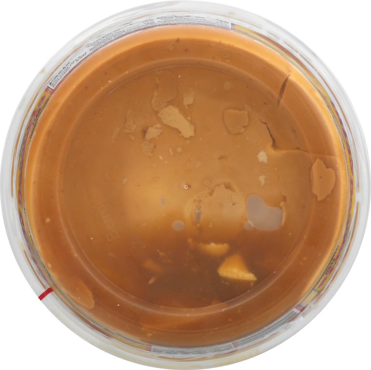 Light yellow color, with a creamy silky smooth texture and caramel syrup at the bottom.
