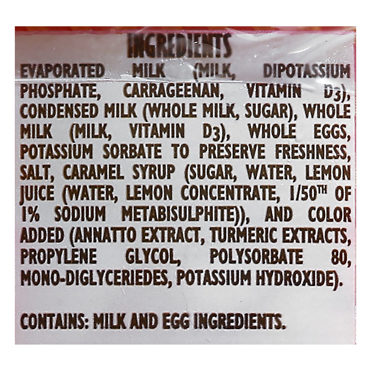 Evaporated Milk (Milk, Dipotassium Phosphate, Carrageenan, Vitamin D3), Condensed Milk (Whole Milk, Sugar), Whole Milk (Milk, Vitamin D3), Whole Eggs, Potassium Sorbate to Preserve Freshness, Salt, Ca…