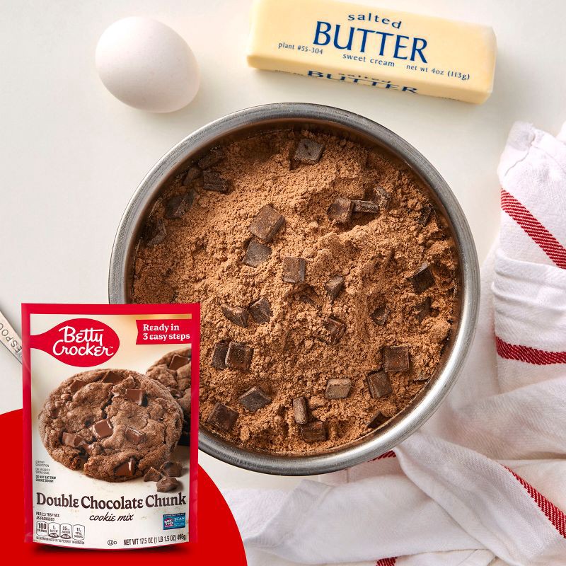 - CONTAINS: One 17.5 oz pouch of Betty Crocker Double Chocolate Chunk Cookie Mix