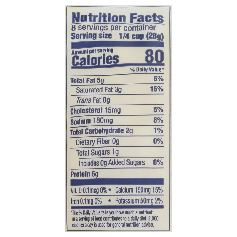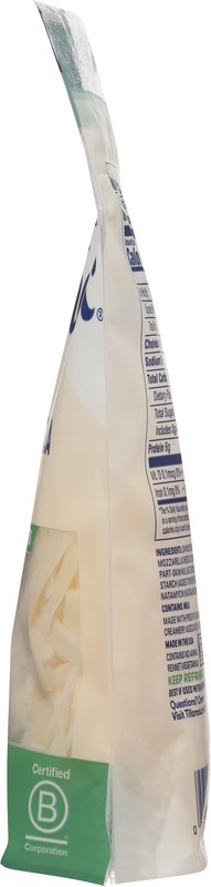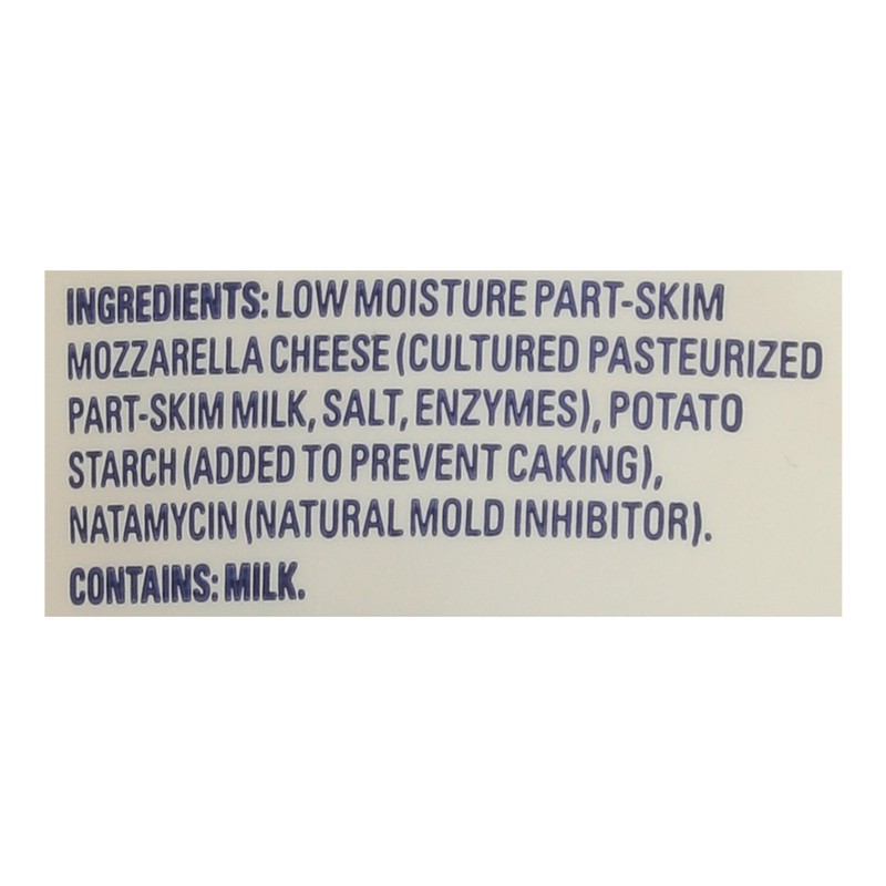 Low Moisture Part-Skim Mozzarella Cheese (Cultured Pasteurized Part-Skim Milk, Salt, Enzymes), Potato Starch (Added to Prevent Caking), Natamycin (Natural Mold Inhibitor).