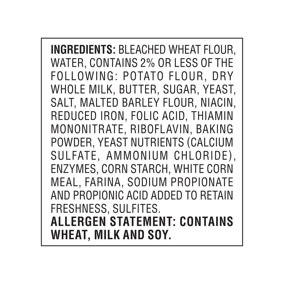 Bleached Wheat Flour, Water, Contains 2% Or Less Of The Following: Potato Flour, Dry Whole Milk, Butter, Sugar, Yeast, Salt, Malted Barley Flour, Niacin, Reduced Iron, Folic Acid, Thiamin Mononitrate,…