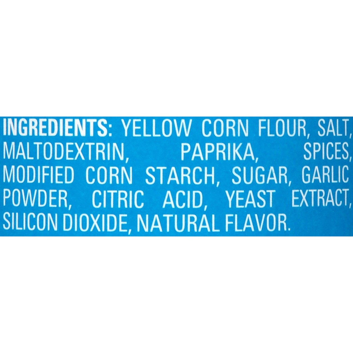 Yellow Corn Flour, Maltodextrin, Salt, Paprika, Spices, Dried Chili Pepper, Sugar, Citric Acid, Yeast Extract, Silicon Dioxide, Natural Flavors, Rosemary and Green Tea Extract (Antioxidant).