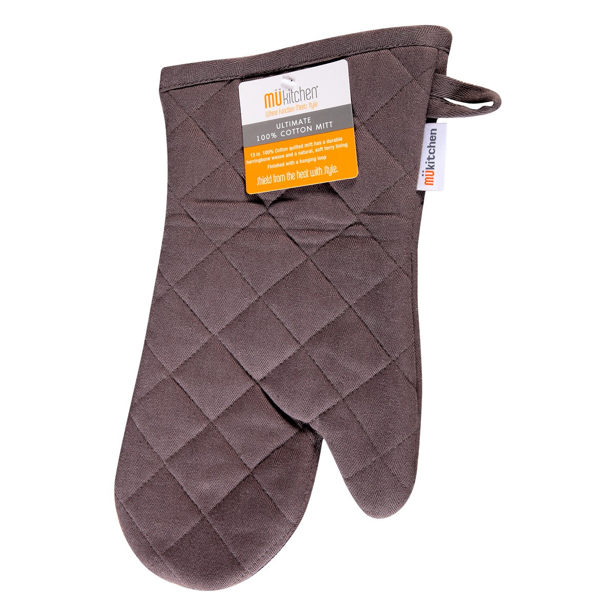 13 in. Where function meets style. 100% cotton quilted mitt has a durable herringbone weave and a natural, soft terry lining. Finished with a hanging top. Shield from the heat with style. Do you MU? w…