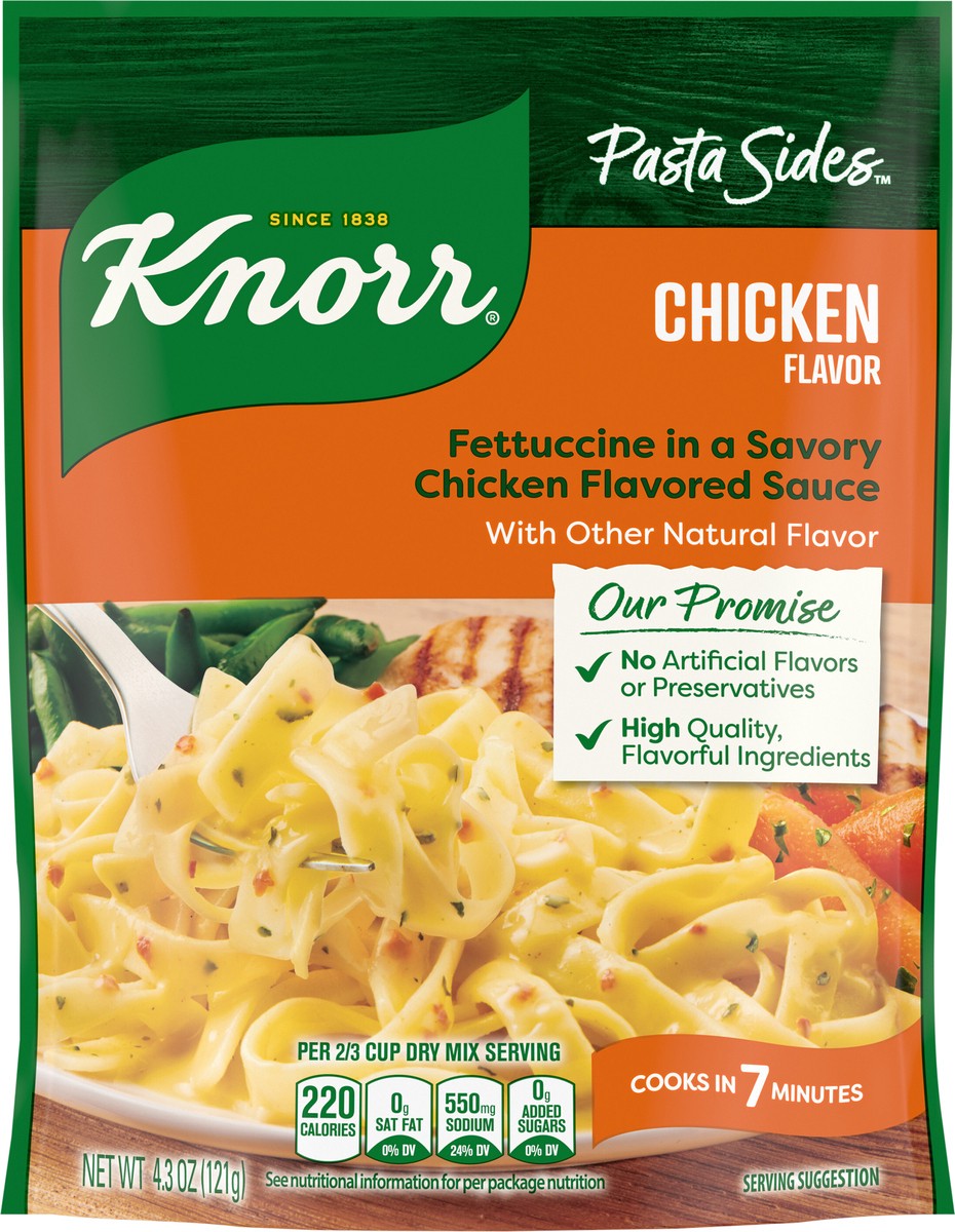 Make great-tasting meals for your family quickly and easily, with our delicious pasta sides. Knorr Pasta Sides Chicken expertly combines fettuccine noodles with red bell peppers, onion, garlic, and pa…