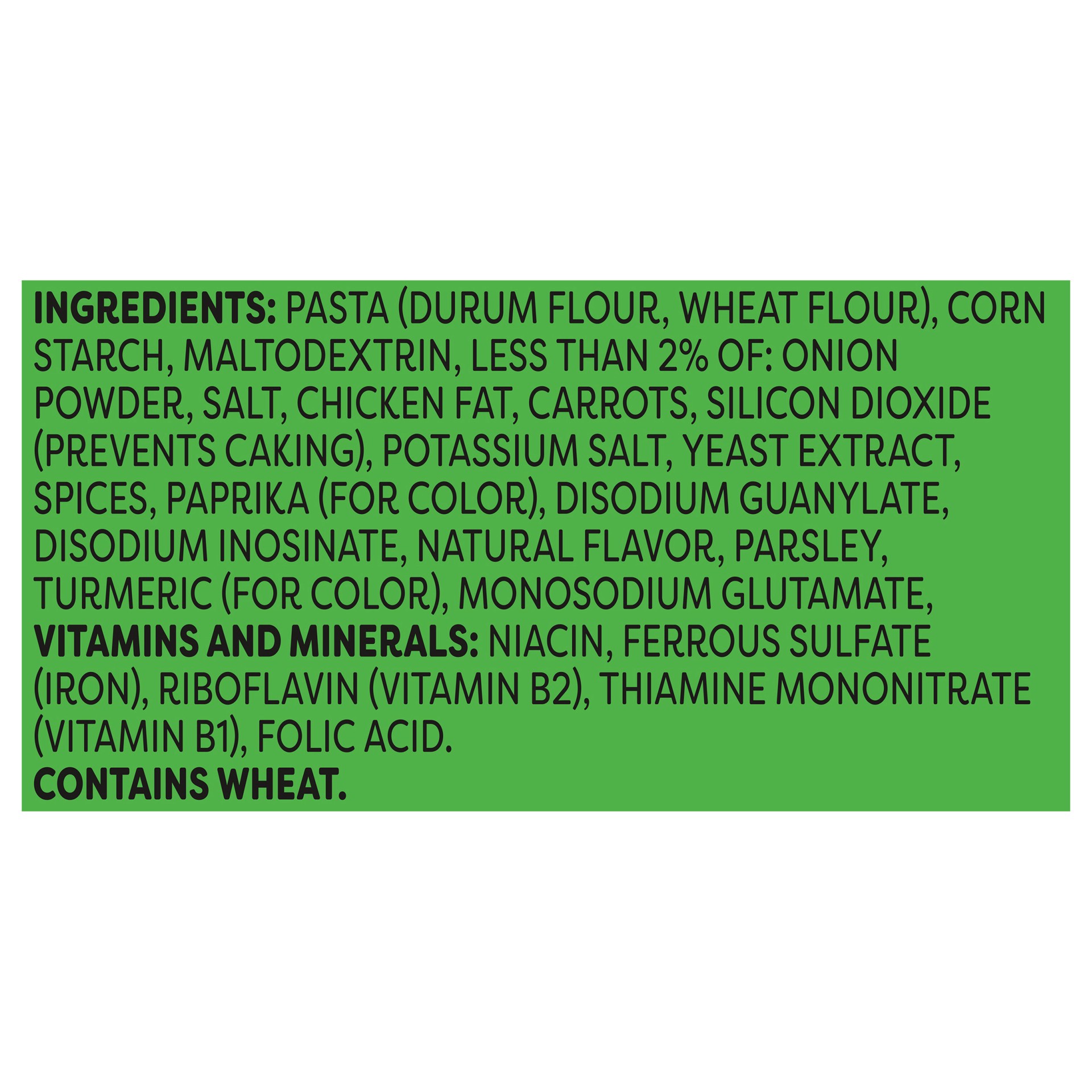 Pasta (Durum Flour, Wheat Flour), Corn Starch, Maltodextrin, Less than 2% of: Onion Powder, Salt, Chicken Fat, Carrots, Silicon Dioxide (Prevents Caking), Potassium Salt, Yeast Extract, Spices, Paprik…