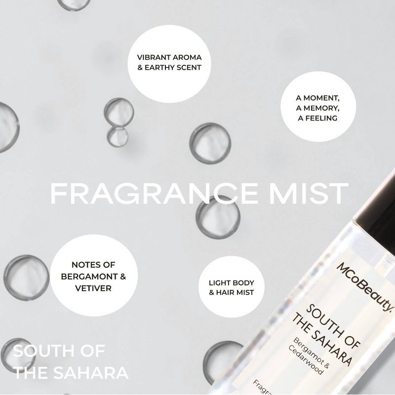 MCoBeauty FRAGRANCE MIST is a deeply evocative spray, with every spritz transporting your senses to an exotic escape. SOUTH OF THE SAHARA whisks you away with notes of Bergamot, Marigold and Cedarwood…