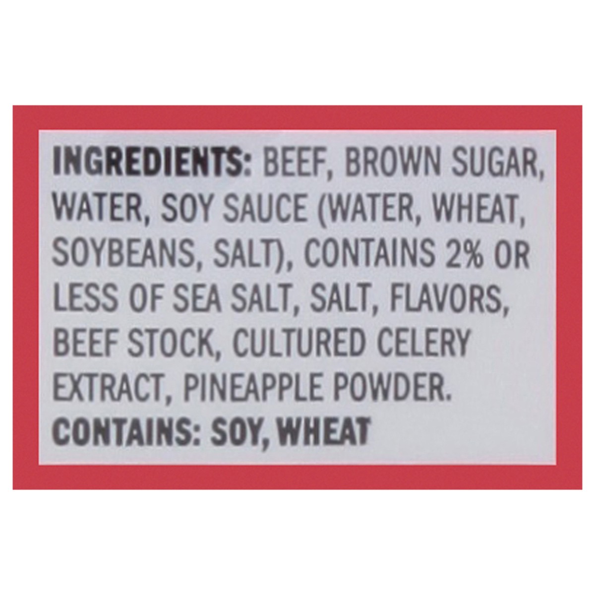 Beef, Brown Sugar, Water, Soy Sauce (Water, Wheat, Soybeans, Salt), Contains 2% or Less of Sea Salt, Salt, Flavors, Beef Stock, Cultured Celery Extract, Pineapple Powder.