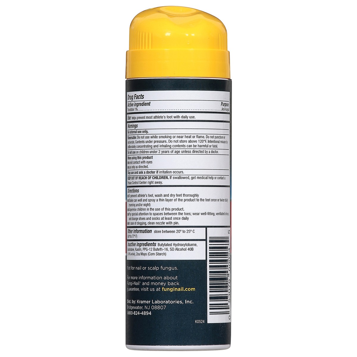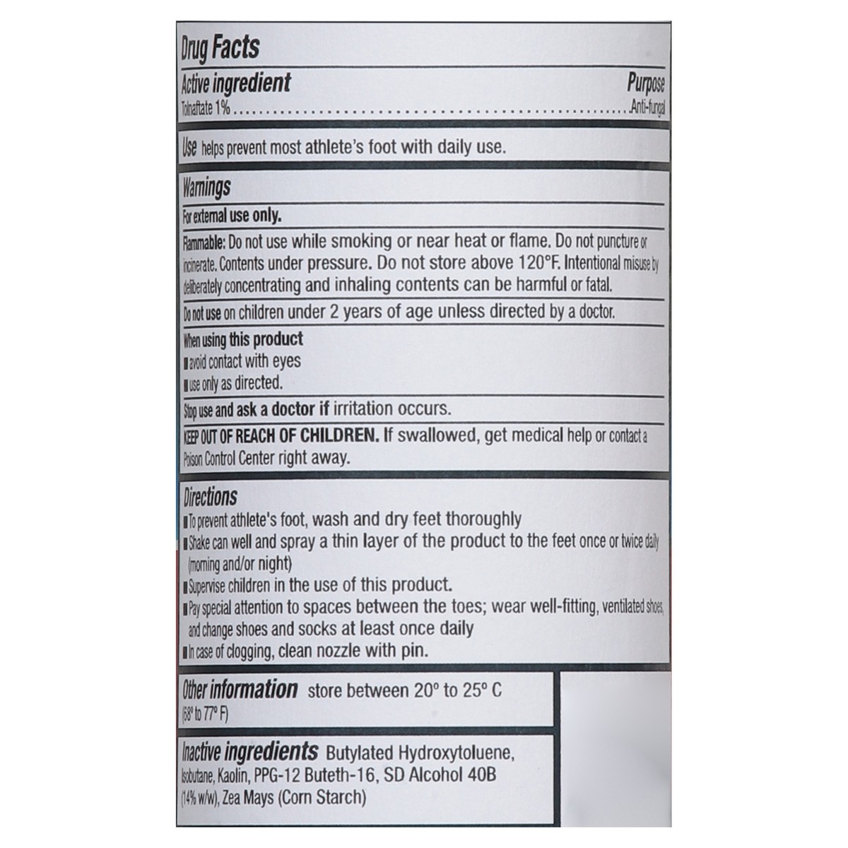 Active Ingredients: Tolnaftate (1 %), Anti-Fungal. Inactive Ingredients: Butylated Hydroxytoluene, Isobutane, Kaolin, PPG-12 Buteth-16, SD Alcohol 40B (14% w/w), Zea Mays (Corn) Starch.