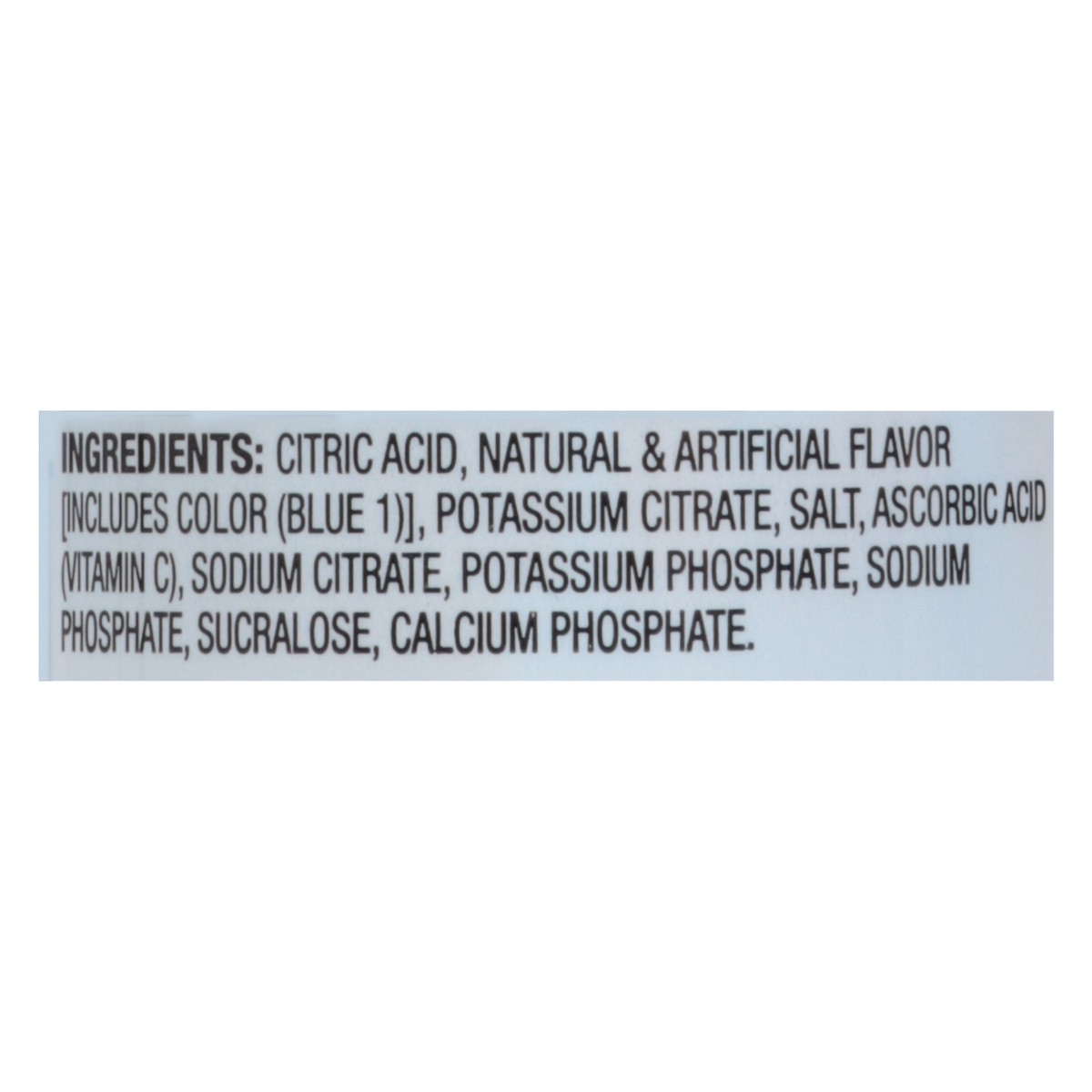 Citric Acid, Natural & Artificial Flavor [Includes Color (Blue 1)], Potassium Citrate, Salt, Ascorbic Acid (Vitamin C), Sodium Citrate, Potassium Phosphate, Sodium Phosphate, Sucralose, Calcium Phosph…