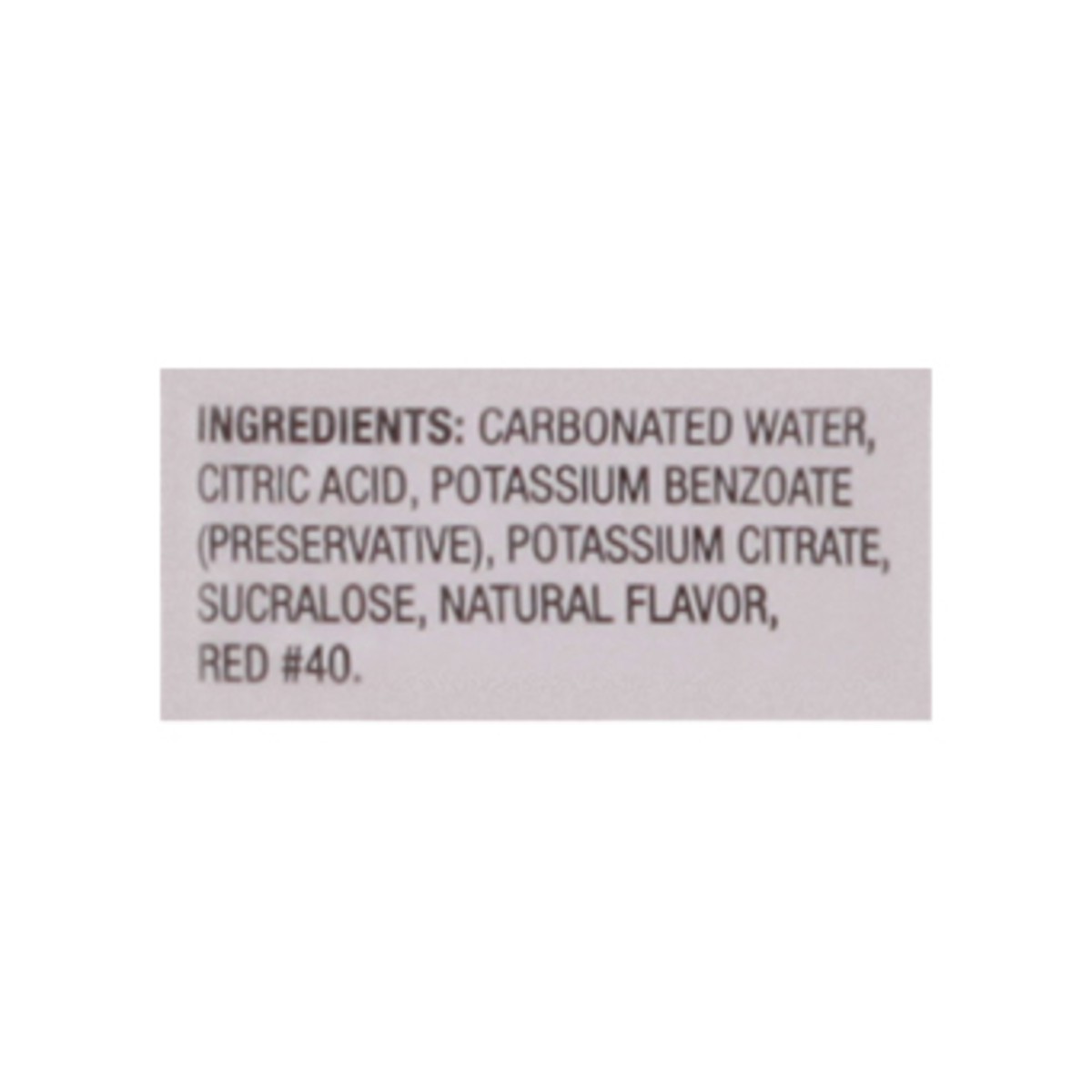 Carbonated Water, Citric Acid, Potassium Benzoate (Preservative), Potassium Citrate, Sucralose Natural Flavor, Red 40.