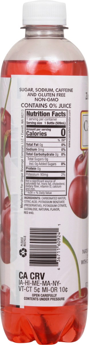 Natural cherry flavored sparkling water with other natural flavor. Sugar, sodium, caffeine and gluten free. Zero calories. Non-GMO. www.cascadeicewater.com. Please recycle.