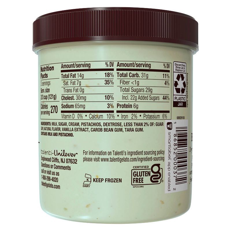 - Talenti Pacific Coast Pistachio Gelato is gluten-free, OU-D Kosher Certified, crafted with non-GMO ingredients, and does not use high fructose corn syrup