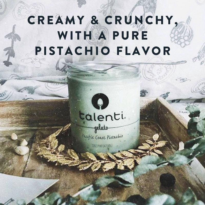 - Talenti Pacific Coast Pistachio Gelato is a rich, smooth, crunchy and creamy gelato that will leave you wanting more