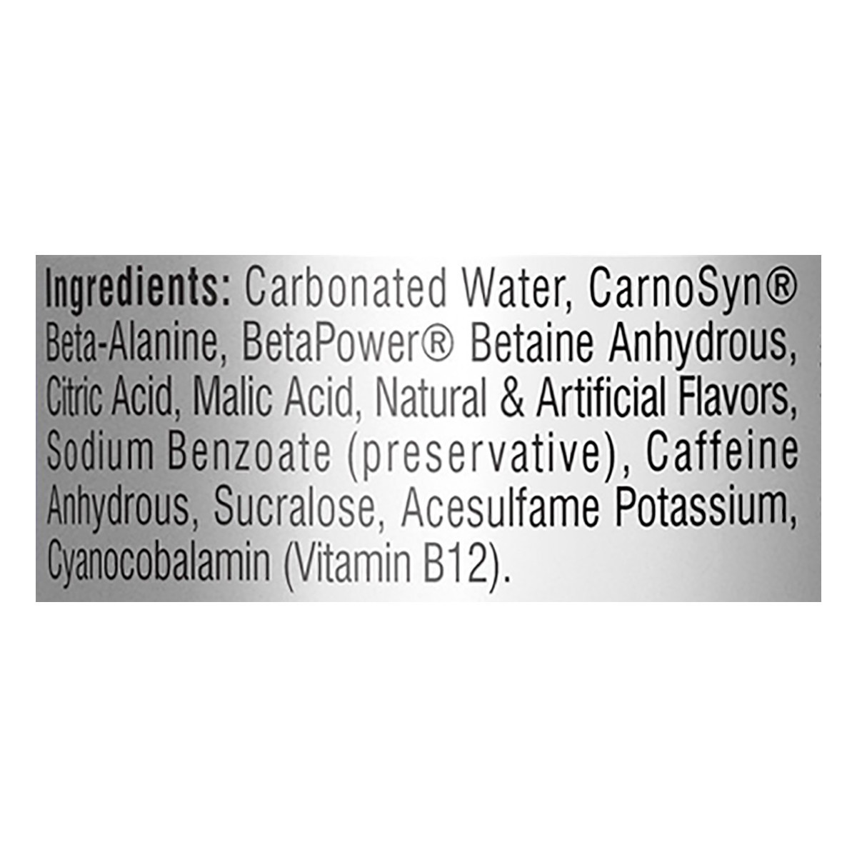 Carbonated Water, Carnosyn Beta-Alanine, Betapower Betaine Anhydrous, Citric Acid, Malic Acid, Natural & Artificial Flavors, Sodium Benzoate (Preservative), Caffeine Anhydrous, Sucralose, Acesulfame P…