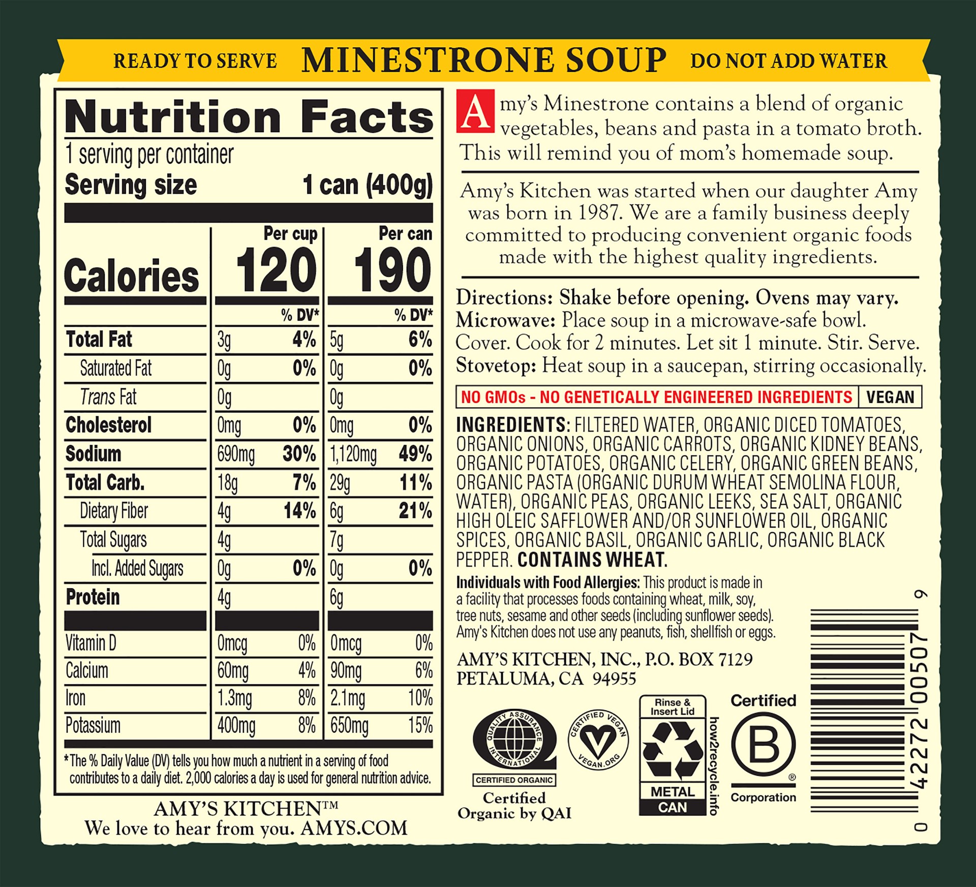 Amy's Organic Minestrone Soup is a low fat (5 grams per can) Italian favorite made from scratch with a rich tomato broth, savory organic vegetables, tender beans and pasta. Convenient and easy to prep…