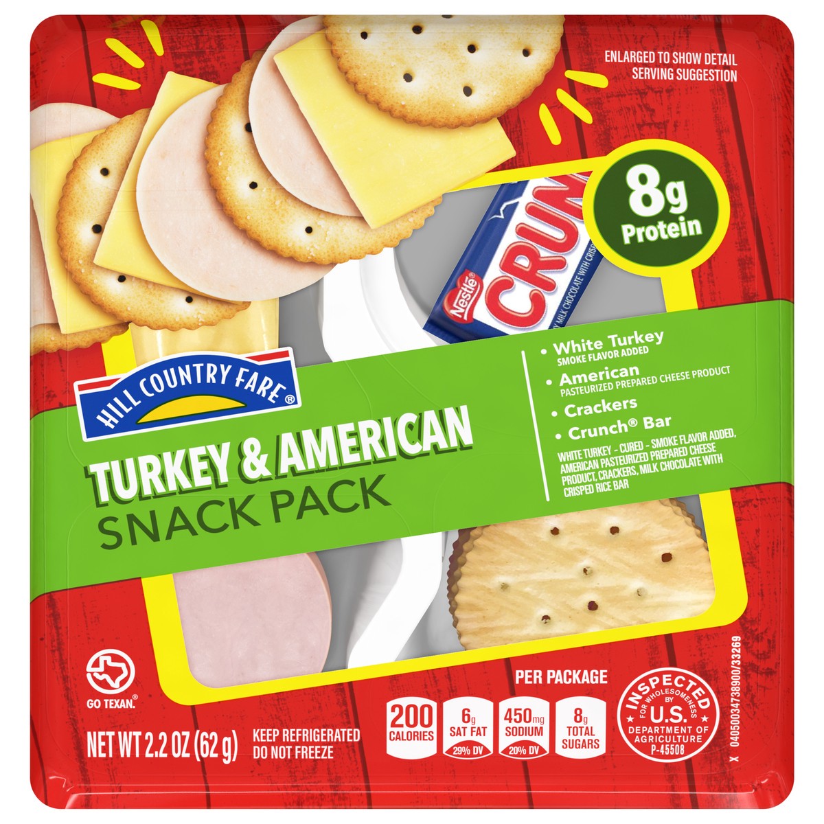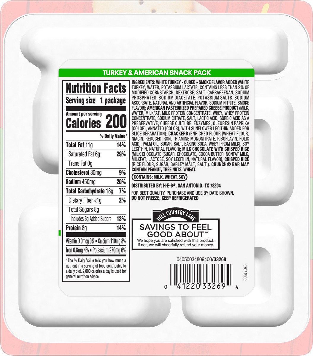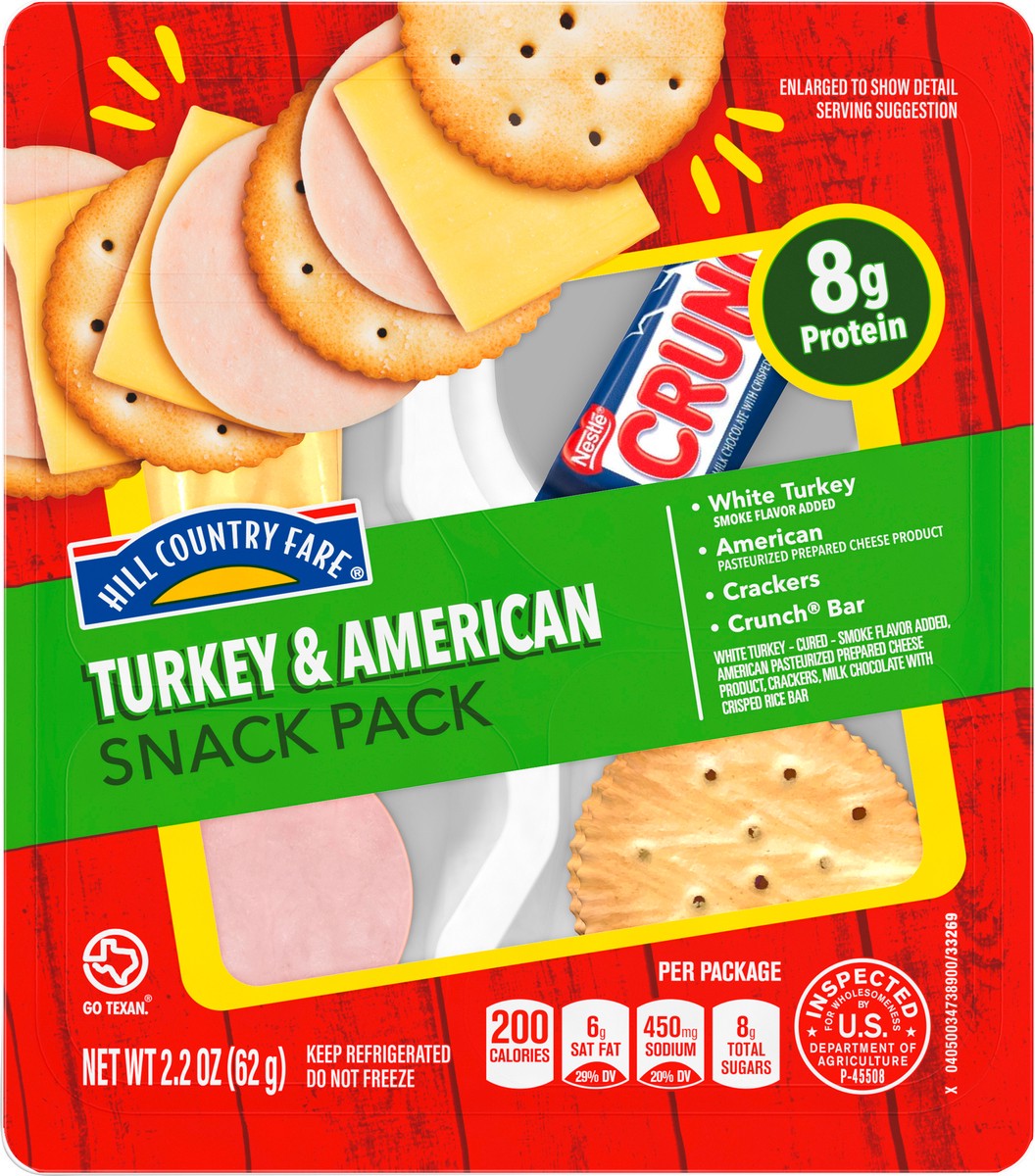 Individual snack pack from Hill Country Fare - with savings to feel good about! This snacking tray contains:• White turkey (smoke flavor added)• American pasteurized prepared cheese product• Crackers•…