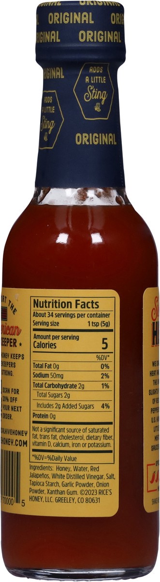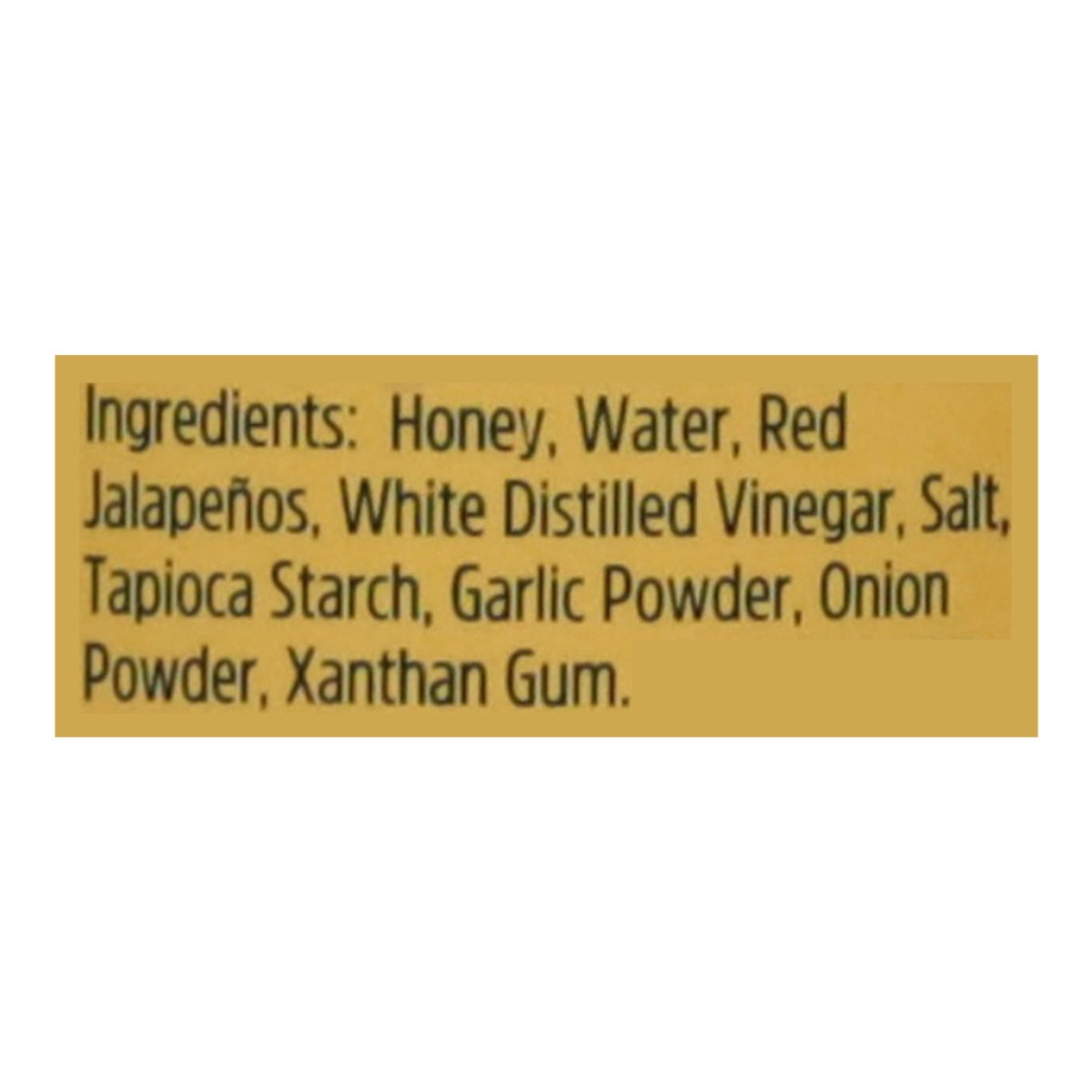 Honey, Water, Red Jalapenos, White Distilled Vinegar, Salt, Tapioca Starch, Garlic Powder, Onion Powder, Xanthan Gum.