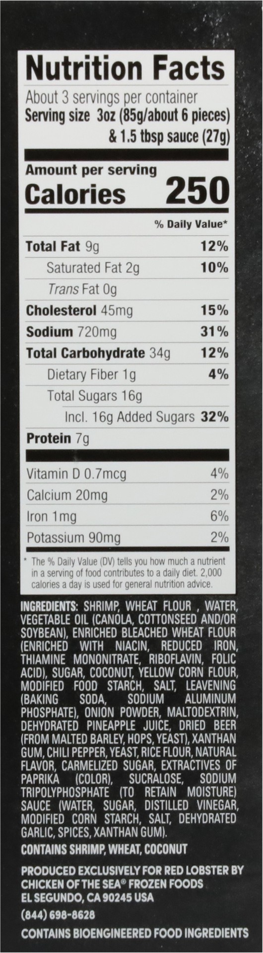 Shrimp, Wheat Flour, Water, Vegetable Oil (Canola, Cottonseed and/or Soybean), Enriched Bleached Wheat Flour (Enriched with Niacin, Reduced Iron, Thiamine Mononitrate, Riboflavin, Folic Acid), Sugar, …