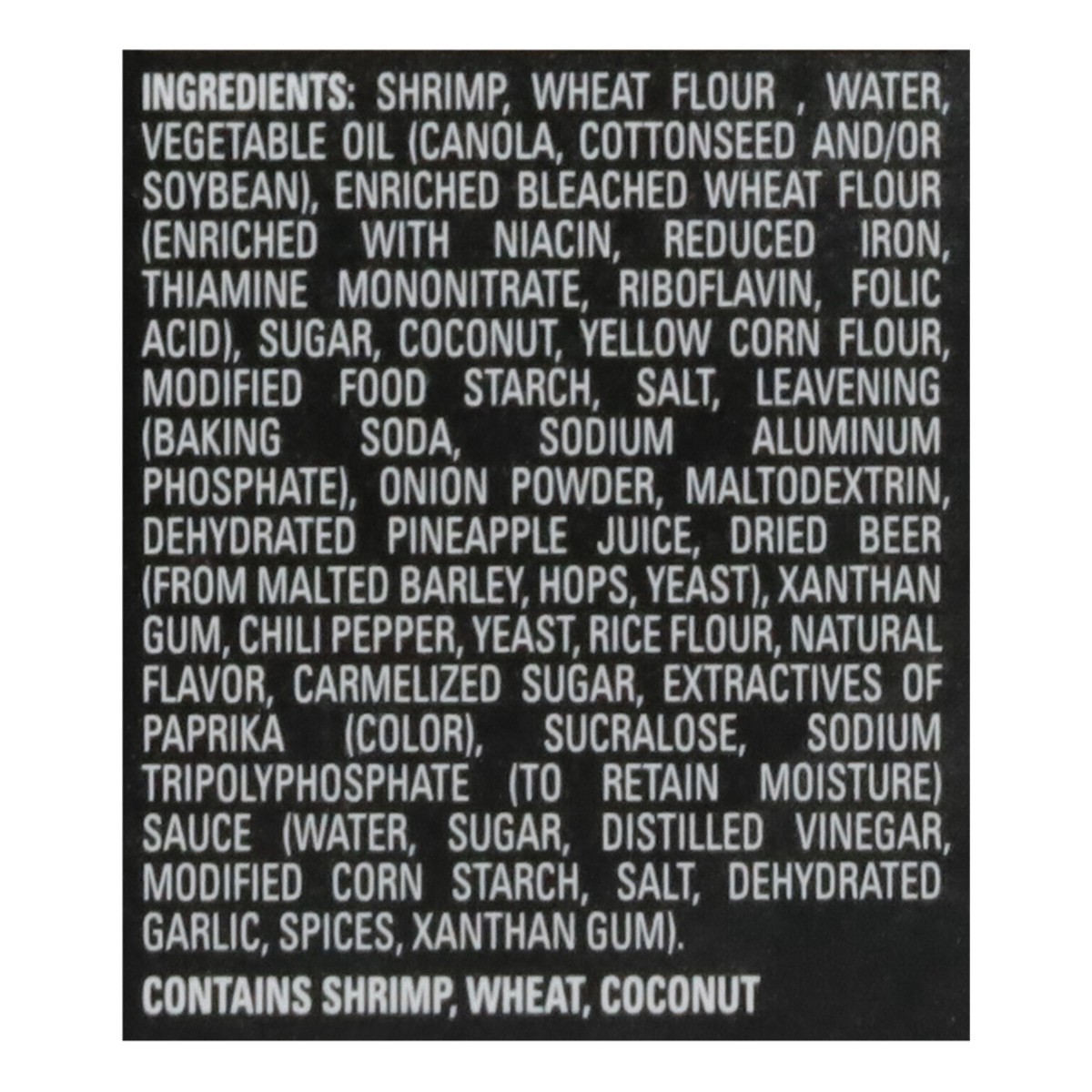 Shrimp, Wheat Flour, Water, Vegetable Oil (Canola, Cottonseed and/or Soybean), Enriched Bleached Wheat Flour (Enriched with Niacin, Reduced Iron, Thiamine Mononitrate, Riboflavin, Folic Acid), Sugar, …