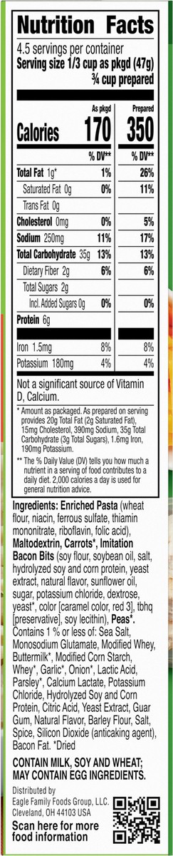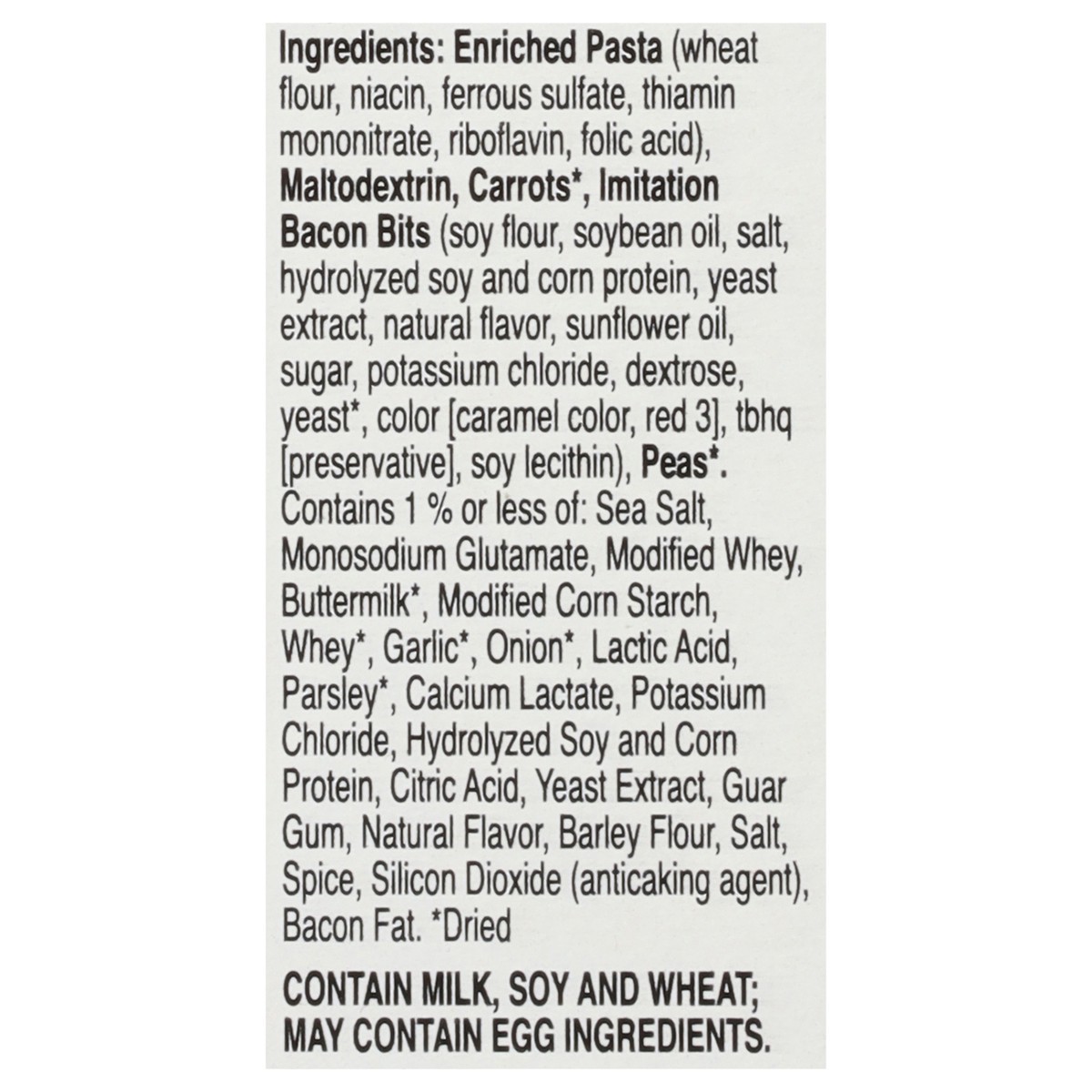 Enriched Pasta (Wheat Flour, Niacin, Ferrous Sulfate, Thiamin Mononitrate, Riboflavin, Folic Acid), Maltodextrin, Carrots*, Imitation Bacon Bits (Soy Flour, Soybean Oil, Salt, Hydrolyzed Soy and Corn …