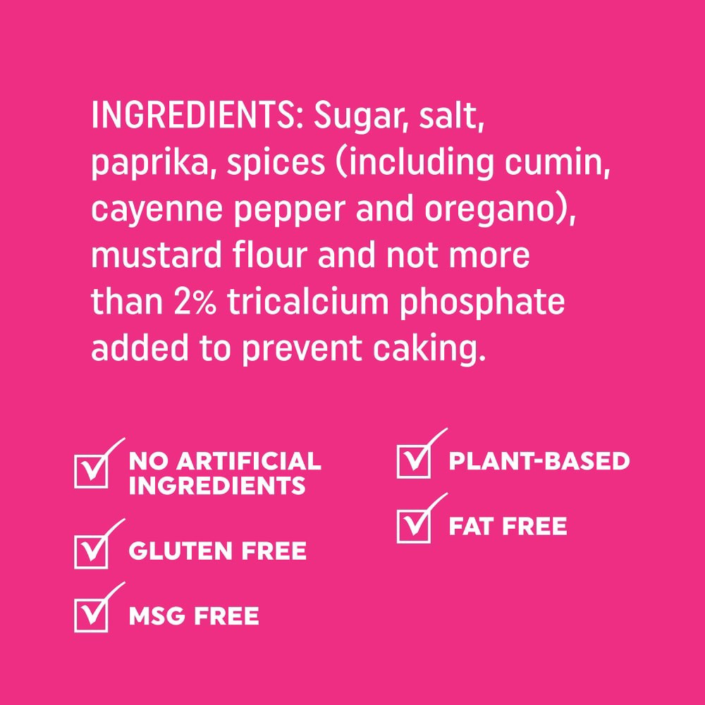 Ingredients: Sugar, Salt, Paprika,Spices (Including Cumin, Cayennepepper And Oregano), Mustard Seedand Not More Than 2% Tricalciumphosphate Added To Prevent Caking.