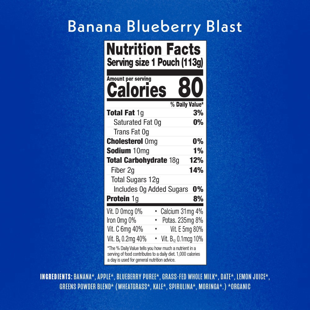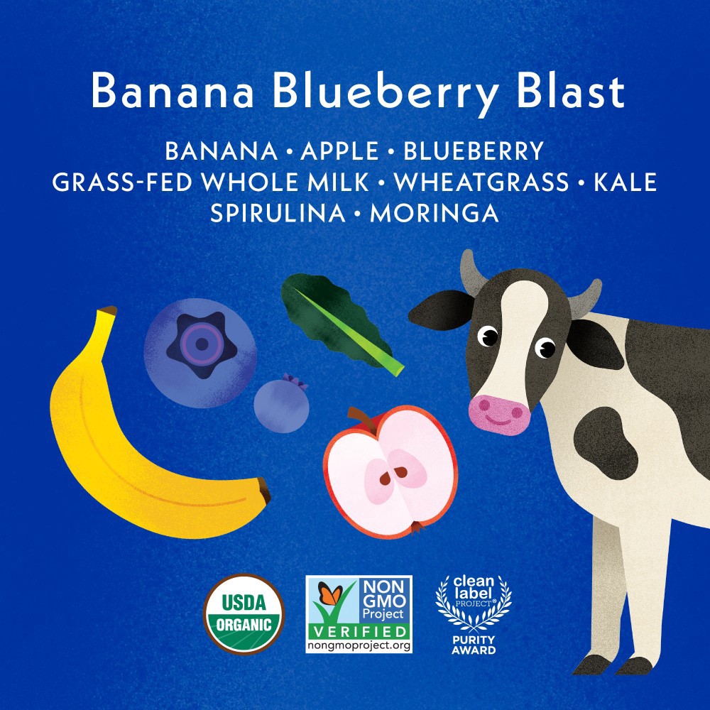 Banana*, Apple*, Blueberry Puree*, Grass-Fed Whole Milk, Date*, Lemon Juice*, Greens Powder Blend* (Wheatgrass*, Kale*, Spirulina, Moringa*.) * Organic.