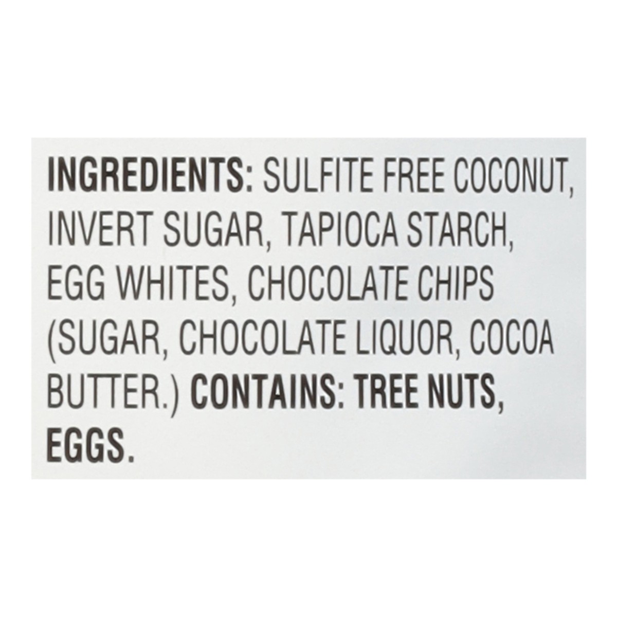 Sulfite Free Coconut, Invert Sugar, Tapioca Starch, Egg Whites, Chocolate Chips (Sugar, Chocolate Liquor, Cocoa Butter).