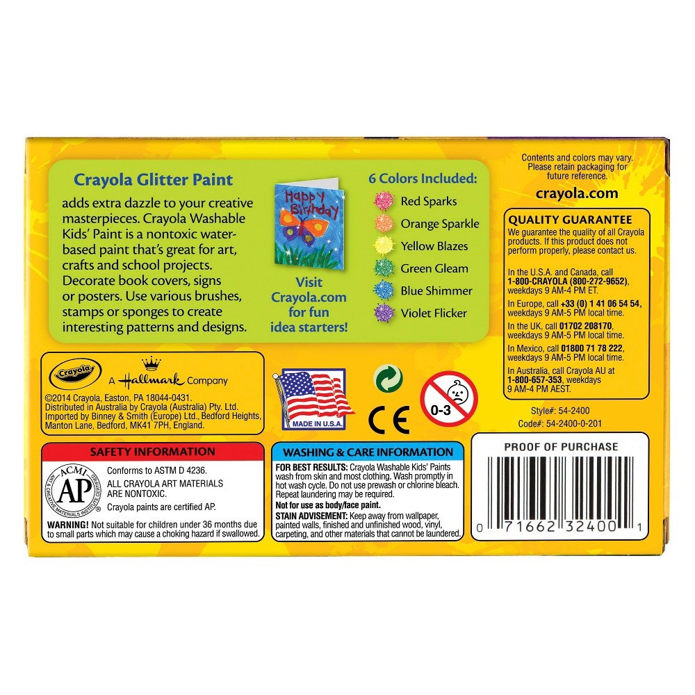 Washability you can trust! Glitter colors! 6 colors. Nontoxic. Crayola Glitter Paint adds extra dazzle to your creative masterpieces. Crayola Washable Kids' Paint is a nontoxic water-based paint that'…
