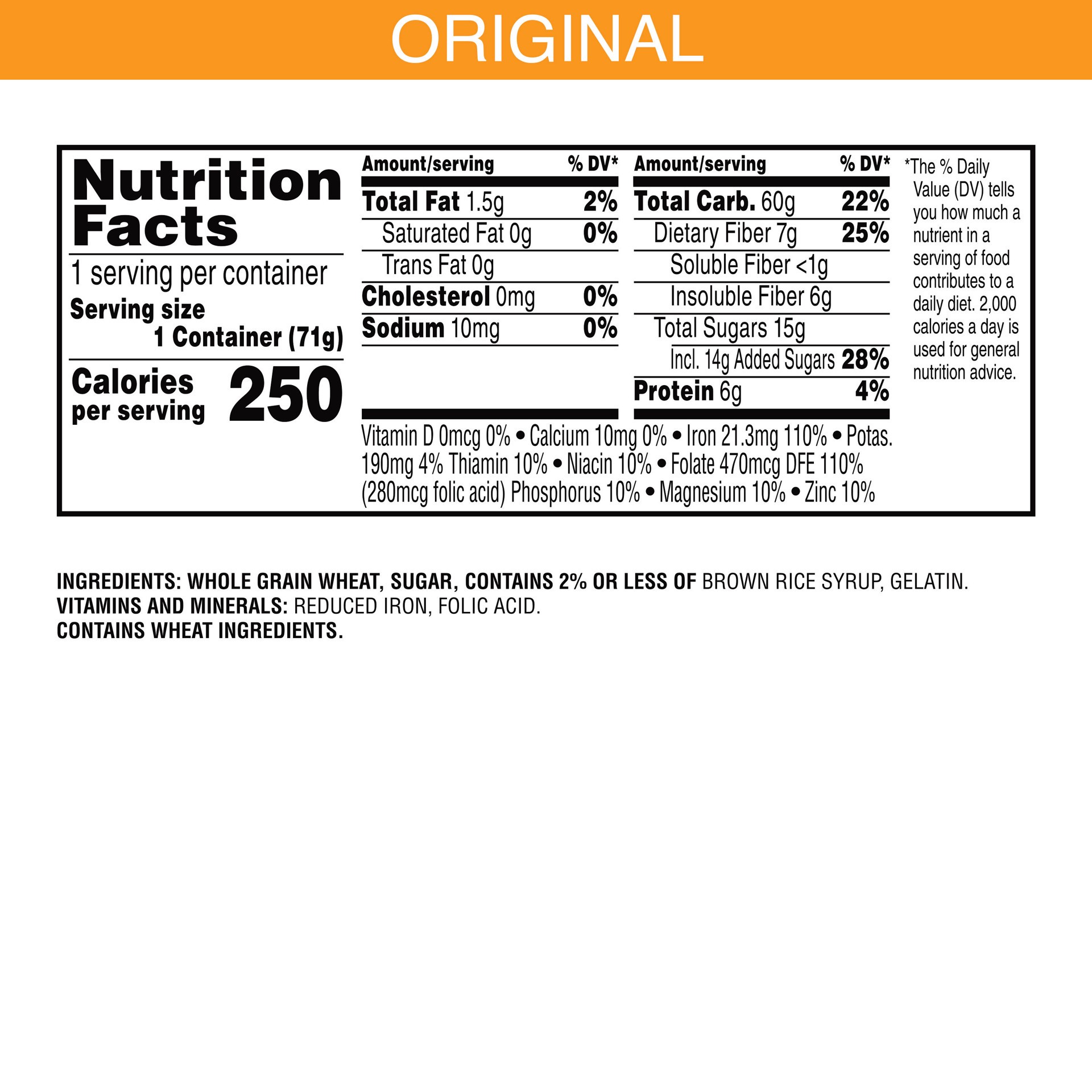 Greet the day with Kellogg's Original Frosted Mini-Wheats, a wholesome, low-fat breakfast cereal that's built for big days. Includes one, 2.5-ounce single-serve cup of Frosted Mini-Wheats breakfast ce…